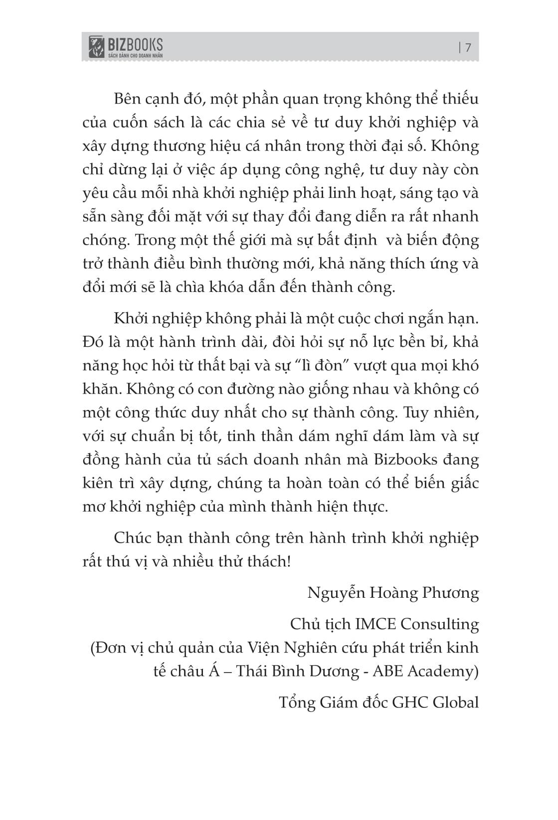 Bên cạnh đó, một phần quan trọng không thể thiếu của cuốn sách là các chia sẻ về tư duy khởi nghiệp và xây dựng thương hiệu cá nhân trong thời đại số. Không chỉ dừng lại ở việc áp dụng công nghệ, tư duy này còn yêu cầu mỗi nhà khởi nghiệp phải linh hoạt, sáng tạo và sẵn sàng đối mặt với sự thay đổi đang diễn ra rất nhanh chóng. Trong một thế giới mà sự bất định và biến động trở thành điều bình thường mới, khả năng thích ứng và đổi mới sẽ là chìa khóa dẫn đến thành công