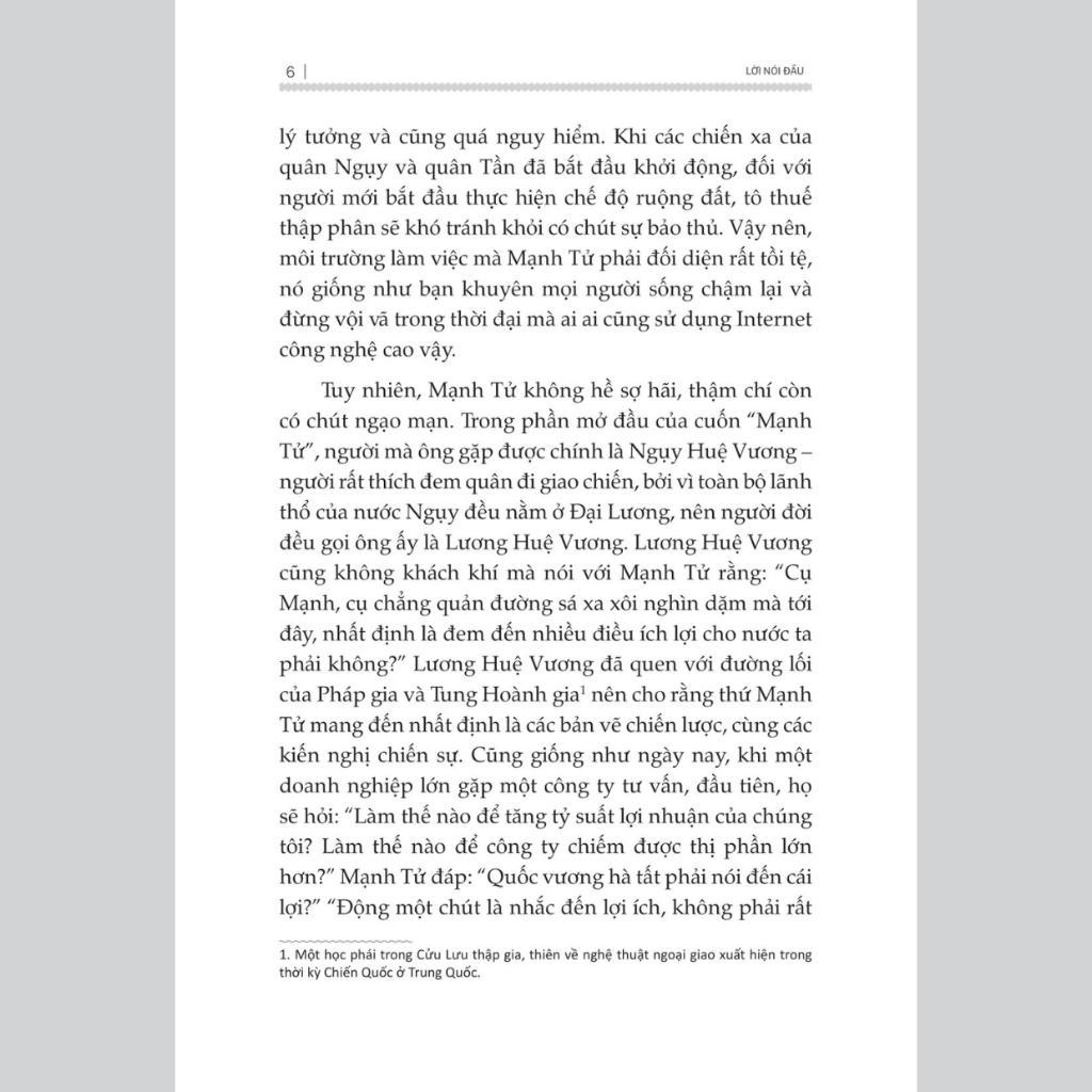 Mạnh Tử rất giỏi hùng biện, ông đã giảng một cách thấu đáo và sinh động về mệnh đề rộng lớn là “Tu thân, tề gia, trị quốc, bình thiên hạ”. Đồng thời ông cũng thể hiện được trải nghiệm sâu sắc và nhạy bén trong cách đối nhân xử thế tài tình của mình. Cho dù hiện tại, bạn đang tự mình kiên trì trên đường đời hay tạm thời lạc lối trước bước ngoặt của số phận, bạn sẽ có được phương hướng và dũng khí để tiếp tục tiến về phía trước thông qua cuốn sách này.