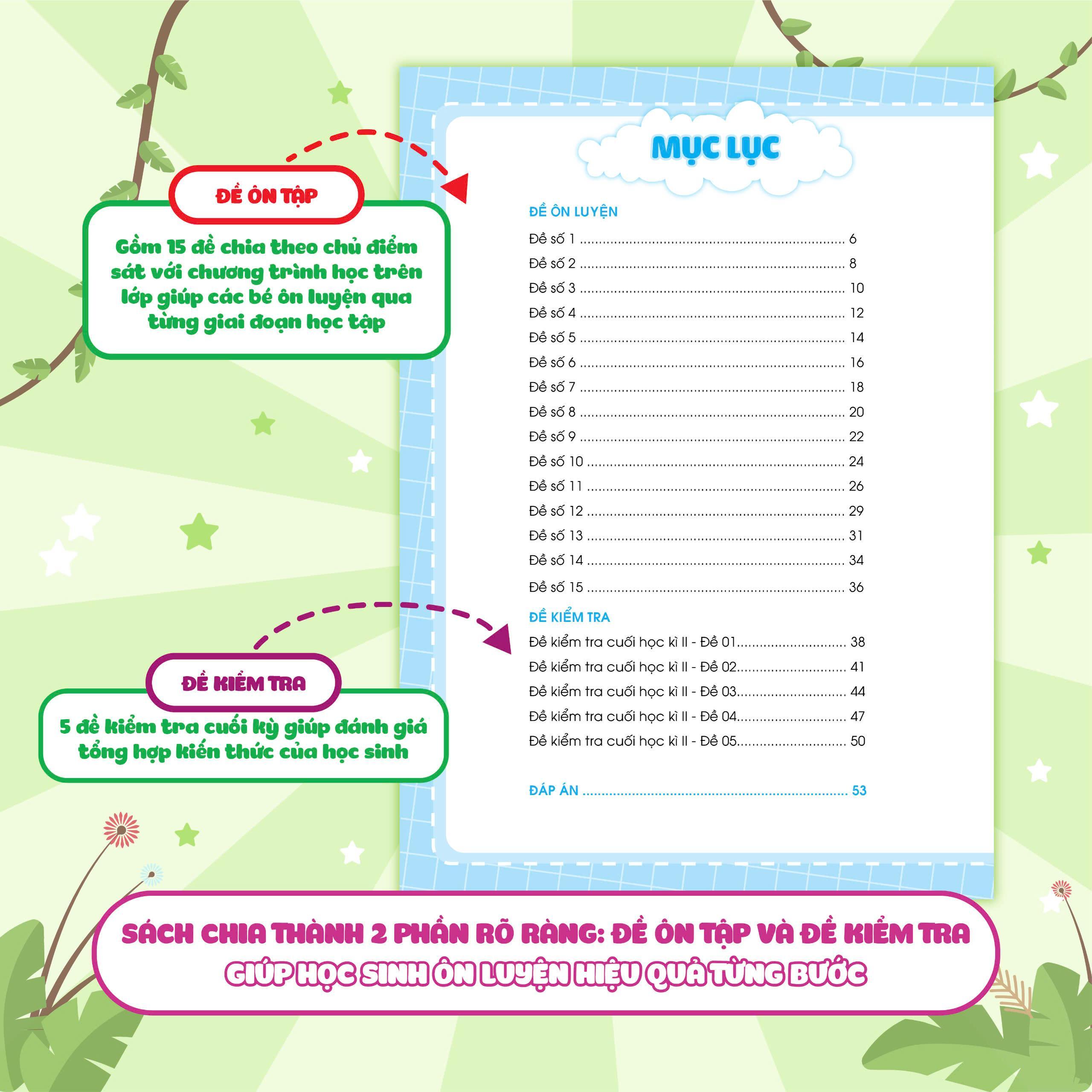 Phần đề ôn tập: gồm 15 đề được chia theo các chủ điểm, ôn tập theo sát chương trình học trên lớp theo giai đoạn.