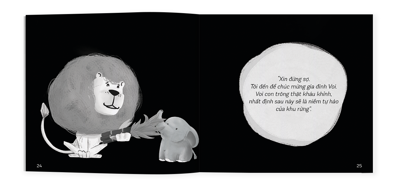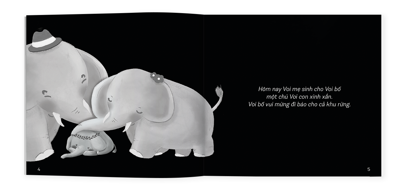 Voi con đến rồi: Gia đình Voi hạnh phúc đón đứa con đầu lòng và muốn chia sẻ niềm vui ấy đến tất cả mọi người trong khu rừng. Voi bố bèn dẫn theo Voi