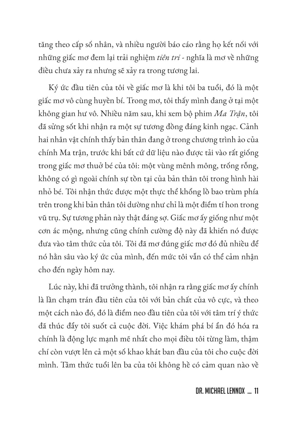 Dựa trên chính những trải nghiệm của ông và hàng ngàn khách hàng, Dr. Lennox phân chia giấc mơ thành nhiều dạng đặc biệt như giấc mơ tiên tri, giấc mơ sáng suốt, giấc mơ chung, giấc mơ thăm viếng… Bạn sẽ học cách nhìn thấy dấu hiệu của tương lai, đón nhận thông điệp từ người đã khuất và bước vào những hành trình của trực giác và tâm trí đầy huyền diệu.