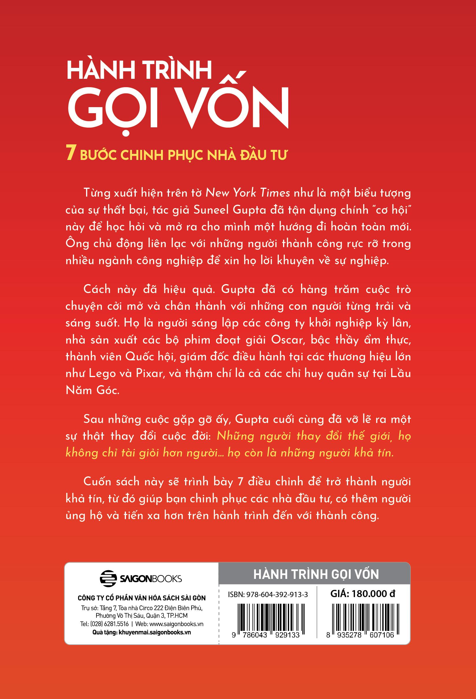 Do đó, tác giả đã viết Hành trình gọi vốn. Cuốn sách này sẽ trình bày 7 điều chỉnh, tương ứng với 7 bước để trở thành người khả tín, từ đó giúp bạn chinh phục các nhà đầu tư, có thêm người ủng hộ và tiến xa hơn trên hành trình đến với thành công.