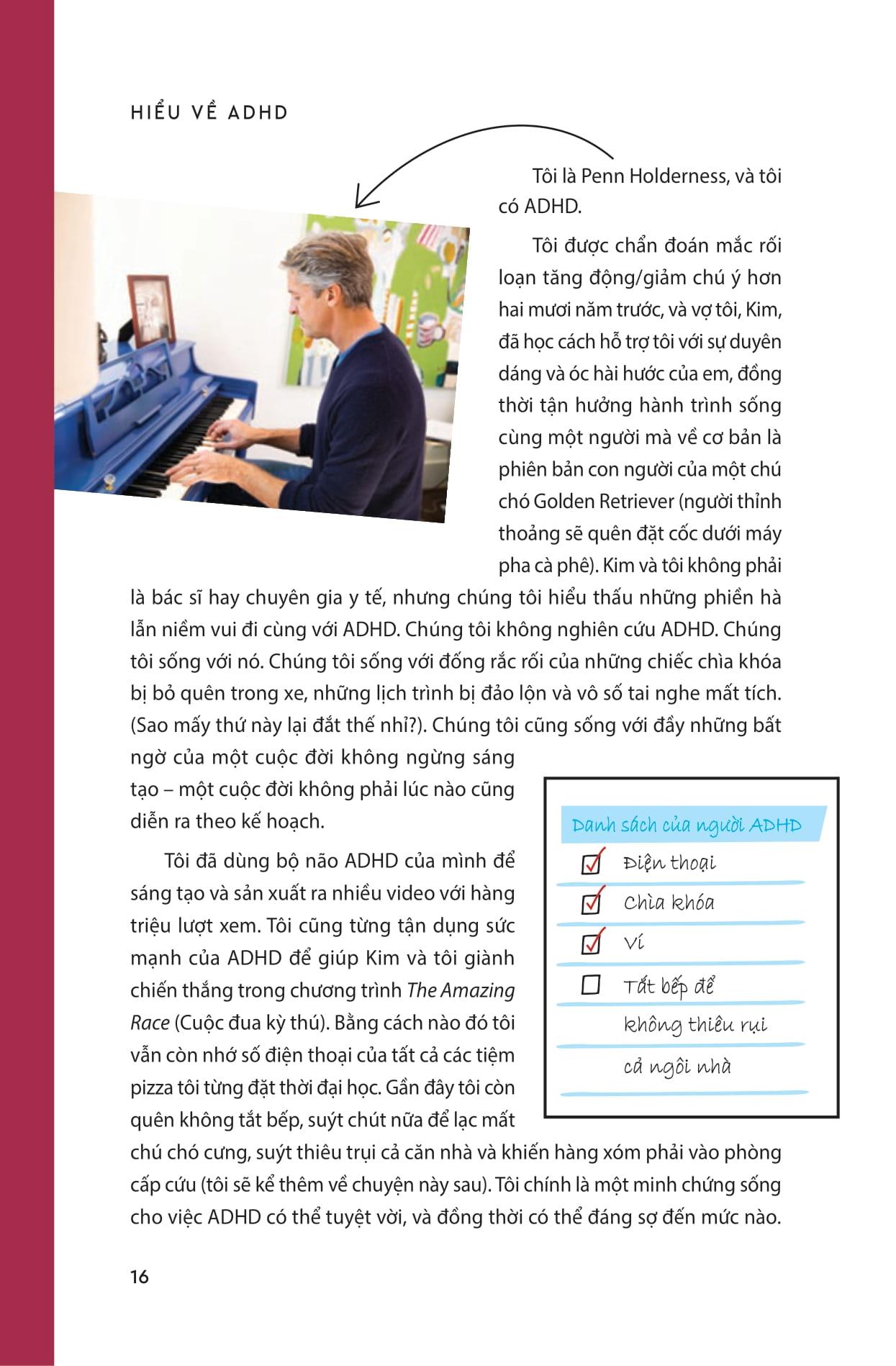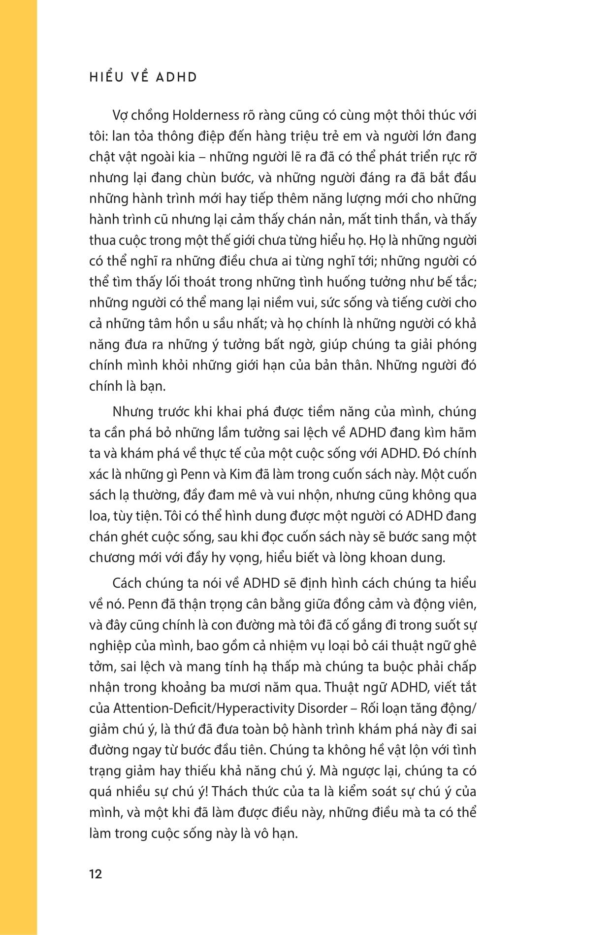 Hiểu Về ADHD - Vượt Qua Thách Thức Và Phát Triển Cùng Rối Loạn Tăng Động Giảm Chú Ý HIỂU VỀ ADHD – KHI SỰ KHÁC BIỆT TRỞ THÀNH LỢI THẾ Có những khoảnh khắc bạn nhìn vào chính m.ình và tự hỏi: “Tại sao m.ình lại như thế này? Tại sao những việc tưởng chừng đơn giản với người khác lại có thể làm m.ình bối rối và mệt mỏi đến vậy?” Nếu bạn hoặc ai đó bạn yêu thương đang sống cùng ADHD, “Hiểu về ADHD” sẽ là cuốn sách mà bạn không chỉ đọc, mà còn cảm thấy được thấu hiểu đến tận cùng. “Hiểu về ADHD” là bản dịch tiếng Việt của ADHD is Awesome, cuốn sách nhanh chóng trở thành New York Times Bestseller, đã bán ra hơn 250.000 bản trên toàn thế giới. Tác giả Penn và Kim Holderness không phải là bác sĩ hay nhà nghiên cứu, họ là những người thật sự sống cùng ADHD mỗi ngày. Penn mắc ADHD hơn hai thập kỷ, Kim là người bạn đời luôn đồng hành, quan sát và hỗ trợ. Chính họ đã mang vào cuốn sách này một giọng kể chân thực, hài hước và đầy ấm áp: điều mà bạn hiếm khi tìm thấy ở những tài liệu nặng về lý thuyết và thuật ngữ y khoa. Thay đổi cách bạn nhìn về ADHD Hiểu về ADHD khác biệt ở chỗ nó không tìm cách “sửa” bạn. Ngay từ những trang đầu, thông điệp đã rõ ràng: ADHD không làm bạn kém giá trị hơn ai cả. Não bộ của bạn chỉ vận hành khác biệt – và chính sự khác biệt đó, nếu biết khai thác, có thể trở thành lợi thế. Cuốn sách đưa bạn vào hành trình nhận diện và phá bỏ những định kiến đã bám rễ quá lâu, để thay thế bằng một cách nhìn mới: coi ADHD là một dạng đa dạng thần kinh, với những thử thách riêng nhưng cũng chứa đựng vô số sức mạnh tiềm ẩn. Nội dung sách được chia thành ba phần. Ở phần đầu, Penn và Kim giải thích ADHD là gì, nguyên nhân từ đâu, biểu hiện ra sao ở trẻ em, người lớn, phụ nữ và các nhóm khác nhau. Bạn sẽ nhận ra những hiểu lầm phổ biến – như việc cho rằng ADHD đồng nghĩa với “thiếu tập trung” hay “lười biếng”, thực chất chỉ là kết quả của sự thiếu hiểu biết về cách não bộ ADHD xử lý thông tin. Phần hai tập trung vào việc thay đổi câu chuyện mà chúng ta vẫn thường kể về ADHD. Thay vì chỉ nói về khuyết điểm và hạn chế, tác giả chỉ ra những khía cạnh tích cực, cả trong công việc, sáng tạo, mối quan hệ và cuộc sống. Cuối cùng, phần ba đưa ra những chiến lược thực tiễn: cách quản lý năng lượng, xây dựng thói quen, điều chỉnh môi trường sống, hoàn thành mục tiêu và chăm sóc bản thân. Đồng hành, thấu hiểu, và cùng bứt phá Điều đặc biệt khiến cuốn sách này gây tiếng vang là cách tác giả đan xen câu chuyện cá nhân với góc nhìn của các chuyên gia. Penn kể về những lần quên khóa cửa, để mất chìa khóa hay bỏ điện thoại trong tủ lạnh, nhưng thay vì chỉ là những tình huống “dở khóc dở cười”, anh và Kim phân tích để rút ra bài học, rồi đưa vào những lời khuyên từ các tên tuổi hàng đầu về ADHD như Tiến sĩ Edward Hallowell, Tiến sĩ Andrea Chronis-Tuscano, Tiến sĩ Marcy Caldwell. Điều này khiến cuốn sách vừa gần gũi như đang nghe hai người bạn tâm sự, vừa đáng tin cậy nhờ sự hậu thuẫn chuyên môn vững chắc. “Hiểu về ADHD” không chỉ dành cho người có ADHD. Nếu bạn là cha mẹ, bạn đời, bạn bè hay đồng nghiệp của họ, cuốn sách này sẽ mở ra một cánh cửa để bạn bước vào thế giới của người ADHD - một thế giới đầy năng lượng, sáng tạo, sự bốc đồng đáng yêu và cả những khó khăn thầm lặng. Bạn sẽ hiểu vì sao có những lúc họ quên mất điều vừa hứa vài phút trước, hay tại sao họ có thể tập trung hàng giờ vào một việc m.ình yêu thích nhưng lại vật lộn với những nhiệm vụ “đơn giản”. Và quan trọng hơn, bạn sẽ biết cách đồng hành mà không phán xét, hỗ trợ mà không áp đặt, để cả hai cùng có một mối quan hệ tốt đẹp hơn. Ngay khi ra mắt, Hiểu về ADHD đã nhận được sự công nhận rộng rãi. Parents gọi đây là “Technicolor Joyride” – một chuyến phiêu lưu rực rỡ sắc màu đúng như nhịp nghĩ của bộ não ADHD. PEOPLE ca ngợi sự kết hợp độc đáo giữa năng lượng sáng tạo và tính chân thực. Hàng ngàn độc giả đã để lại lời nhắn “Tôi cũng vậy!” khi thấy m.ình được phản chiếu trong những câu chuyện của Penn và Kim. Đọc cuốn sách này, bạn sẽ cười vì những tình huống khó đỡ, sẽ thấy lòng m.ình nhẹ đi khi nhận ra m.ình không hề đơn độc, và sẽ tìm thấy những công cụ để sống hài hòa hơn với bộ não khác biệt của m.ình. Hiểu về ADHD không hứa hẹn biến mọi thứ trở nên hoàn hảo, nhưng chắc chắn sẽ giúp bạn nhận ra: bạn không phải là một mớ hỗn độn hay một thảm họa, bạn là một con người đầy màu sắc, và thế giới này cần sự hiện diện của bạn đúng như bạn vốn có.