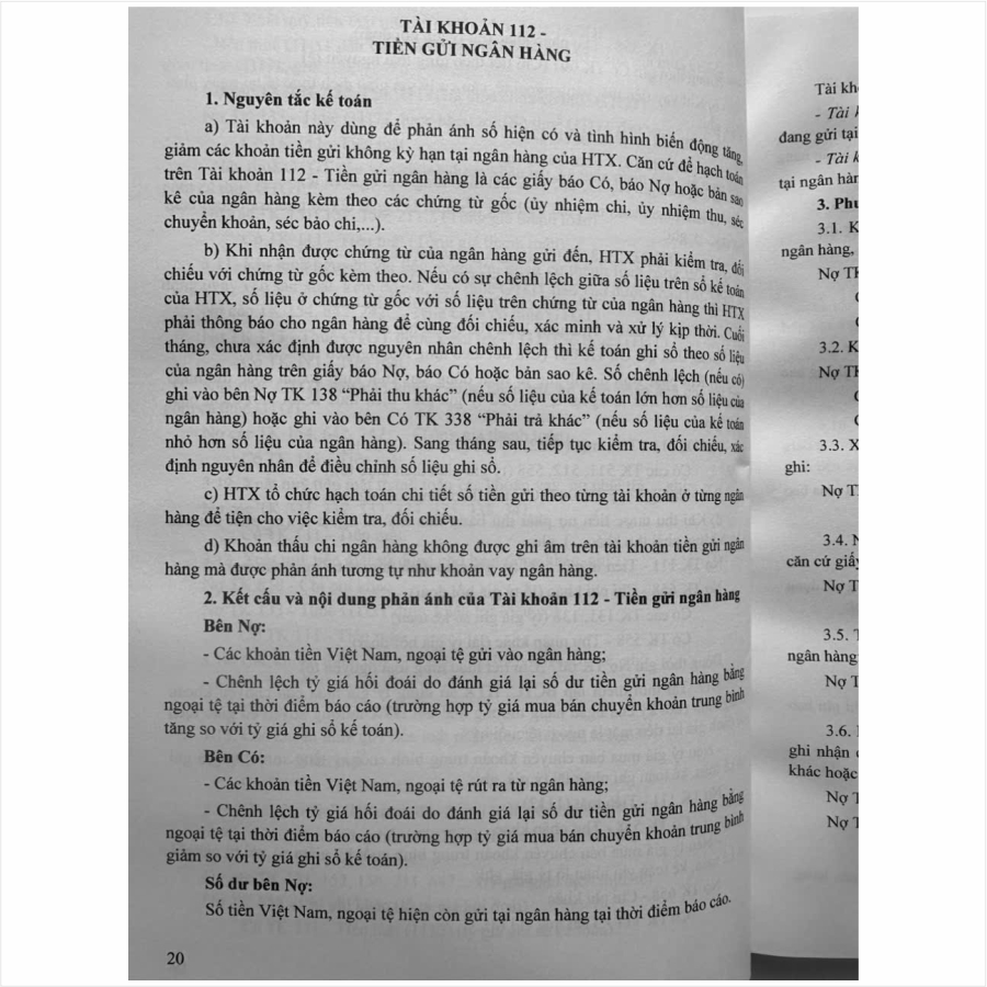 - Toàn bộ sách bìa mềm khổ lớn 19 x 27 cm phân phối bởi Nhà sách Nam Việt đều được bọc sách Plastic MIỄN PHÍ và xuất hóa đơn điện tử đầy đủ, nhanh chóng. …//… Lời giới thiệu: Ngày 07 tháng 10 năm 2024, Bộ Tài chính đã chính thức ban hành Thông tư số 71/2024/TT-BTC hướng dẫn Chế độ kếtoán hợp tác xã, liên hiệp hợp tác xã. Nhằm hướng dẫn về chứng từ kế toán, tài khoản kế toán, nguyên tắc ghi sổ kế toán, lập và trình bày Báo cáo tài chính của hợp tác xã, liên hiệp hợp tác xã; không áp dụng cho việc xác định nghĩa vụ thuế của hợp tác xã đối với ngân sách Nhà nước. Việc ghi sổ kế toán phải căn cứ vào các chứng từ kế toán được phản ánh trên cơ sở các giao dịch kinh tế phát sinh và đã hoàn thành. Hợp tác xã phải tuân thủ các quy định của pháp luật, cơ chế, chính sách liên quan khi thực hiện các giao dịch kinh tế. Nhằm phổ biến đến Quý Cơ quan, Đơn vị và Quý khách hàng thân thiết nắm bắt kịp thời những quy định mới nêu trên. Nhà sách Nam Việt xin trân trọng giới thiệu cuốn sách: Hướng Dẫn Chế Độ Kế Toán Hợp Tác Xã, Liên Hiệp Hợp Tác Xã theo Thông Tư Số 71/2024/TT-BTC ngày 07/10/2024 …//… Nội dung cuốn sách bao gồm những nội dung chính như sau: Chương I. QUY ĐỊNH CHUNG Chương II. QUY ĐỊNH CỤ THỂ Chương III. ĐIỀU KHOẢN THI HÀNH Phụ lục I. DANH MỤC HỆ THỐNG TÀI KHOẢN KẾ TOÁN Phụ lục II. DANH MỤC, BIỂU MẪU VÀ PHƯƠNG PHÁP LẬP CHỨNG TỪ KẾ TOÁN Phụ lục III. DANH MỤC SỔ KẾ TOÁN, BIỂU MẪU SỔ KẾ TOÁN VÀ PHƯƠNG PHÁP GHI SỔ KẾ TOÁN VÀ HÌNH THỨC SỔ KẾ TOÁN Phụ lục IV. BIỂU MẪU BÁO CÁO TÀI CHÍNH, NỘI DUNG VÀ PHƯƠNG PHÁP LẬP, TRÌNH BÀY BÁO CÁO TÀI CHÍNH *** Quý khách hàng hãy an tâm khi mua sách tại Nhà sách Nam Việt, cam kết uy tín, chất lượng, sách bản gốc chuẩn đẹp, được kiểm hàng, hài lòng mới thanh toán, sách đã được bọc plastic cao cấp miễn phí! …//… Cảm ơn các bạn đã ghé thăm shop Nhà sách Nam Việt ! Sách Hướng Dẫn Chế Độ Kế Toán Hợp Tác Xã, Liên Hiệp Hợp Tác Xã theo Thông Tư Số 71/2024/TT-BTC ngày 07/10/2024 Sách Hướng Dẫn Chế Độ Kế Toán Hợp Tác Xã, Liên Hiệp Hợp Tác Xã theo Thông Tư Số 71/2024/TT-BTC ngày 07/10/2024
