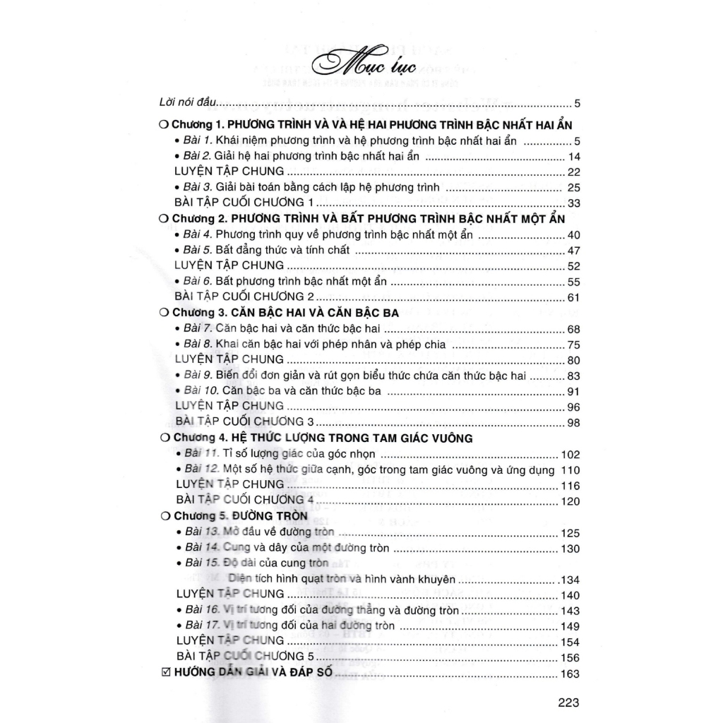 1. Nội dung sách tổng ôn toán học lớp 9 Tập 1 gồm 4 chương: - Chương 1: Căn bậc hai, căn bậc ba. - Chương 2: Hàm số bậc nhất. - Chương 3: Hệ
