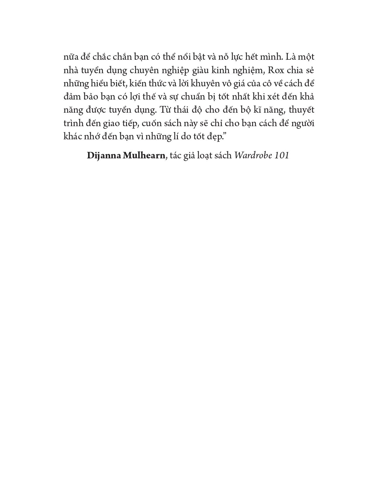 Tác giả Roxanne Calder không phải nhà tuyển dụng mà bạn thường thấy. Cách tiếp cận của bà đối với công việc và cuộc sống là đi sâu và trực tiếp đối đầu với từng thử thách bằng cả trái tim. Trong quản lí và tuyển dụng, bà thích nhìn thấy tiềm năng trong con người. Khám phá những phẩm chất tiềm ẩn của con người là kĩ năng của bà.