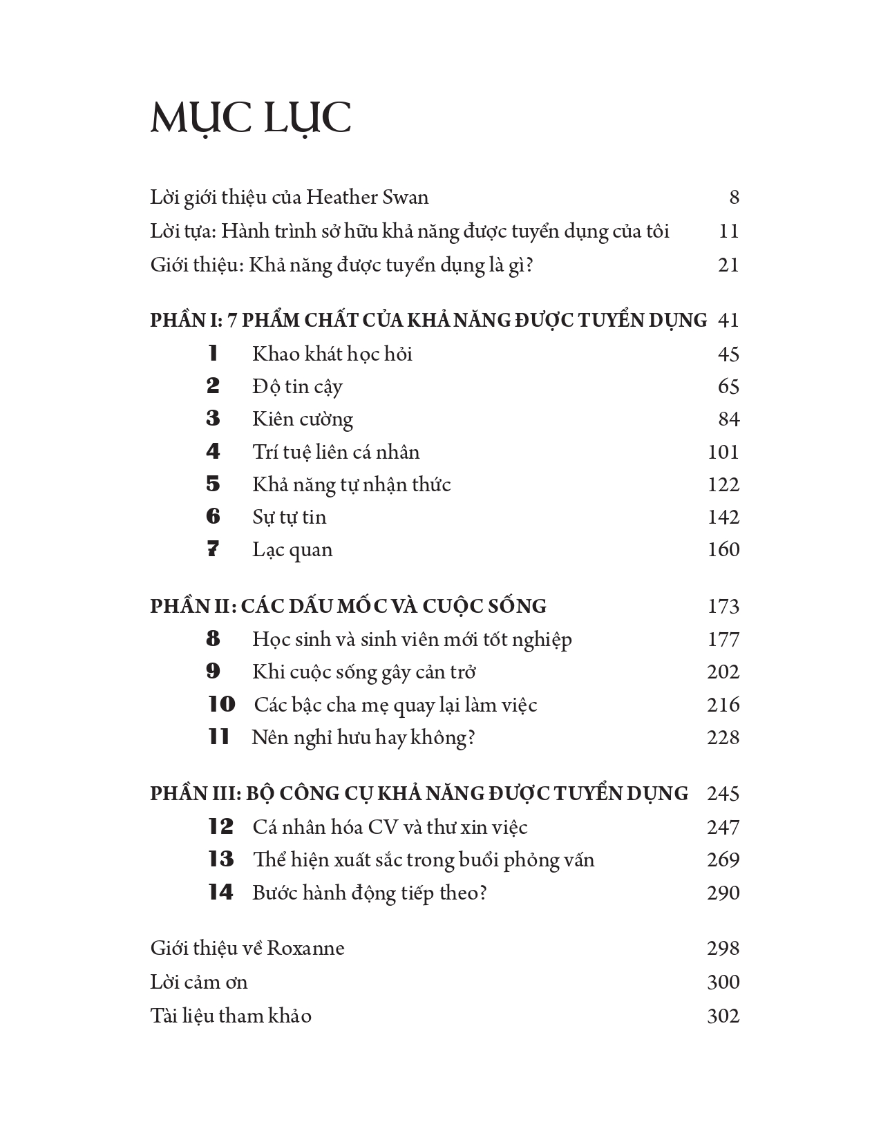 Liệt kê và phân tích đầy đủ 7 phẩm chất của khả năng được tuyển dụng, đồng thời đưa ra các dấu mốc cuộc sống cũng như cung cấp bộ công cụ để bạn có thể gây ấn tượng với các nhà tuyển dụng, cuốn sách là một tài liệu đầy sống động và thiết thực, một vũ khí thiết yếu trong trận chiến chống lại sự bất định hay bấp bênh trong công việc. Chứa đựng những câu chuyện thú vị và ví dụ thực tế, cuốn sách khám phá các "bí quyết" để sở hữu khả năng được tuyển dụng.