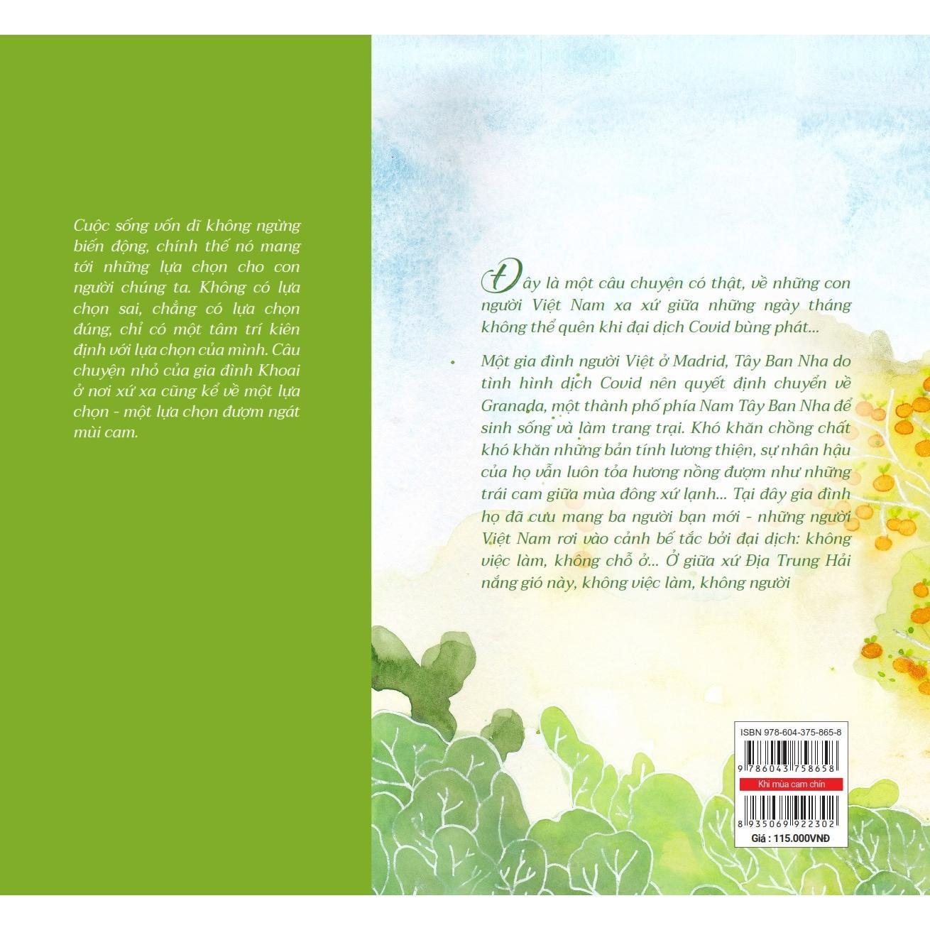 Đây là một câu chuyện có thật, về những con người Việt Nam xa xứ giữa những ngày tháng không thể quên khi đại dịch bùng phát… Một gia đình người Việt ở Madrid, Tây Ban Nha do tình hình dịch nên quyết định chuyển về Granada, một thành phố phía Nam Tây Ban Nha để sinh sống và làm trang trại. Khó khăn chồng chất khó khăn những bản tính lương thiện, sự nhân hậu của họ vẫn luôn tỏa hương nồng đượm như những trái cam giữa mùa đông xứ lạnh… Tại đây gia đình họ đã cưu mang ba người bạn mới - những người Việt Nam rơi vào cảnh bế tắc bởi đại dịch: không việc làm, không chỗ ở… Ở giữa xứ Địa Trung Hải nắng gió này, không việc làm, không người thân. không dư dả tiền bạc,… lại muốn giúp đỡ cả những người khác, họ chỉ có thể dựa vào hai bàn tay và trái tim không ngừng yêu thương,… Rồi cuộc sống của họ sẽ ra sao, những người bạn mới của họ sẽ thế nào? Hãy đọc Khi mùa cam chín để có thêm niềm tin vào tình người giữa cuộc đời đầy những gian nan, và cũng để không ngừng hy vọng vào một tương lai tươi sáng, khi mùa cam chín, tất cả chúng ta đều sẽ ổn và bình yên trở lại…
