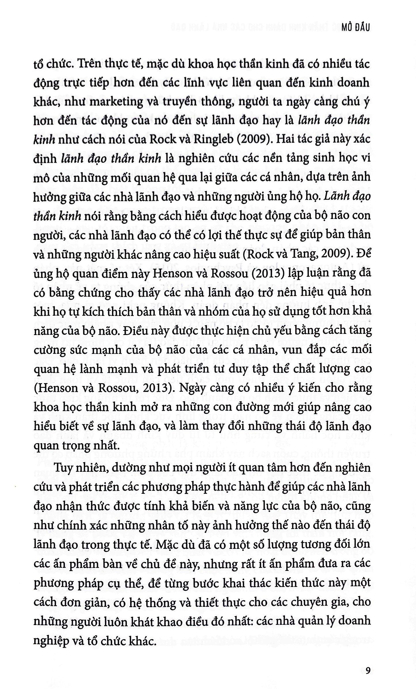 khoa học thần kinh dành cho các nhà lãnh đạo “tôi tin chắc rằng kết quả kinh doanh là kết quả trực tiếp của những nỗ lực tập thể, được dẫn dắt bởi một tầm nhìn mạnh mẽ và bởi sự lãnh đạo thậm chí còn mạnh mẽ hơn. tuy nhiên, cho đến bây giờ, vẫn rất khó giải thích bản chất thực sự của sự lãnh đạo, bất kể việc chúng ta trải nghiệm nó hàng ngày. tiến sĩ dimitriadis và tiến sĩ psychogios đã cố gắng để bật mí bí ẩn về sự lãnh đạo hiệu quả thông qua làm rõ cách thức bộ não hoạt động trong môi trường kinh doanh phức tạp. bạn hãy đọc sách, thực hành, và trở thành một nhà lãnh đạo vĩ đại!” - tổng giám đốc, coca-cola hbc slovenia, croatia, bosnia và herzegovina. cuốn sách “khoa học thần kinh dành cho các nhà lãnh đạo” đã bật mí bí ẩn về sự lãnh đạo, nó bắt nguồn từ một nơi rất cụ thể và hữu hình: bộ não con người. tuy nhiên, dường như mọi người ít quan tâm đến nghiên cứu và phát triển các phương pháp thực hành để giúp các nhà lãnh đạo nhận thức được tính khả biến và năng lực của bộ não, cũng như chính xác những nhân tố này ảnh hưởng thế nào đến thái độ lãnh đạo trong thực tế. thông qua sử dụng các nghiên cứu đa dạng và tiên tiến trên phạm vi toàn cầu, nhóm tác giả đã xây dựng một phương pháp toàn diện, cụ thể, nhưng đồng thời cũng đơn giản khi áp dụng để giúp các nhà quản lý và các chuyên gia nâng cao năng lực lãnh đạo của họ. xuất phát từ suy nghĩ đó, chúng tôi đề xuất phương pháp bal (brain-adaptive ership) – sự lãnh đạo thích ứng với bộ não như một phương pháp suy nghĩ, cảm nhận và hành động bên trong các thực thể xã hội có tổ chức. phương pháp bao gồm 04 trụ cột chính: tư duy, cảm xúc, tính tự động của bộ não và các mối quan hệ. bal là một cách tiếp cận về thái độ mà các cá nhân có thể làm theo để cố gắng hiểu bộ não và ảnh hưởng của nó đến hành vi của họ, để lãnh đạo các dự án, quá trình và con người. cách tiếp cận này có thể là một phần của lĩnh vực khoa học thần kinh ứng dụng rộng lớn hơn. đặc biệt “tính ứng dụng” của cuốn sách này dành cho những người cần triển khai phương pháp lãnh đạo mới và hiệu quả nhất có thể. mục lục trụ cột 1: tư duy