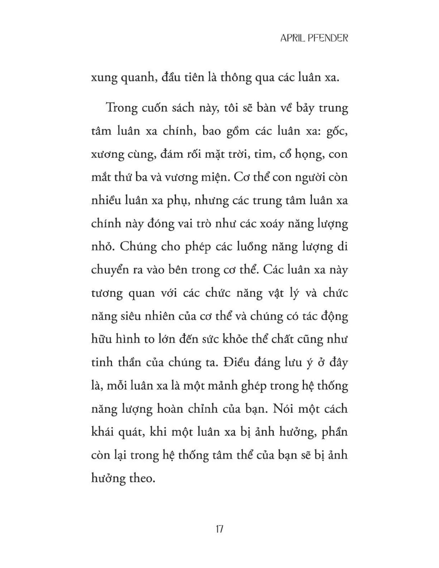 Sách là cuốn cẩm nang chi tiết hướng dẫn cách đả thông 7 luân xa chính trong cơ thể bằng thiền, qua đó giúp người thực hành tự chữa lành và duy trì sức khỏe, thúc đẩy bản thân phát triển thành phiên bản tốt nhất của chính m.ình. April đặc biệt thiết kế cuốn sách phù hợp với nhịp sống hiện đại hiện nay, vì với mỗi luân xa cần khai thông cô đều giới thiệu 3 bài tập với thời lượng lần lượt là 5, 15 và 30 phút cùng bài tập mở rộng tùy chọn cũng như mẹo nhỏ hữu ích; từ đó giúp người đọc chọn được lộ trình thực hành thiền phù hợp nhất với bản thân.
