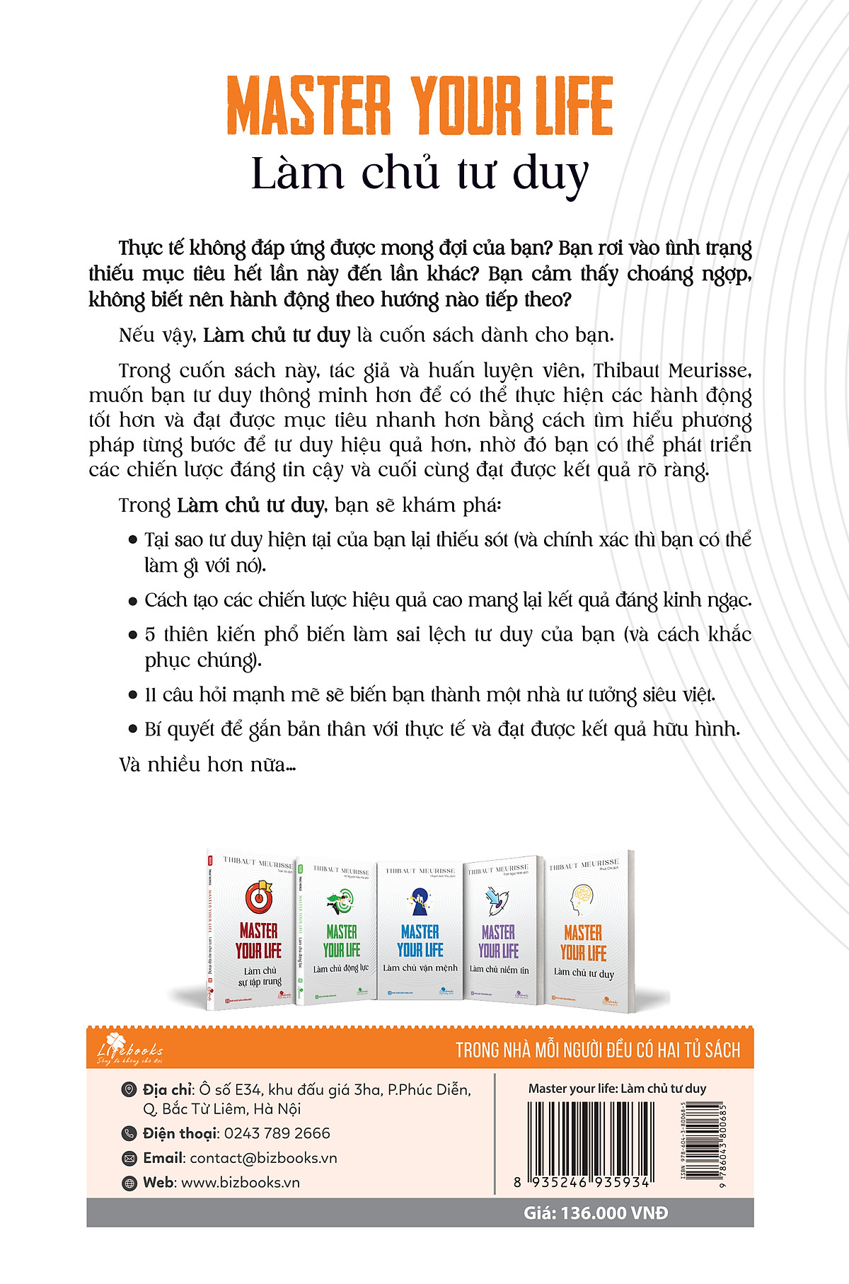Muốn có thay đổi, việc đầu tiên bạn cần nghĩ về thay đổi, mong muốn thay đổi và sẵn sàng thay đổi ở mức độ tư duy. Nghe thì dễ, nhưng những rào cản tâm lý chính là trở ngại lớn nhất khi bạn quyết định thay đổi. Rất nhiều suy nghĩ tồn tại thâm căn cố đế, hạn chế khả năng phát triển của bạn mà chính bạn cũng không nhận ra. Đã đến lúc bạn cần sở hữu cuốn sách Master your life - Làm chủ tư duy do công ty sách Bizbooks xuất bản và phát hành.
