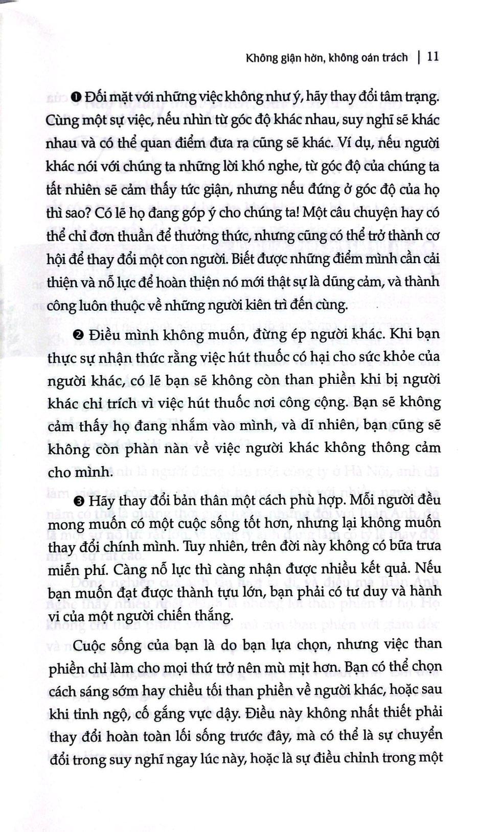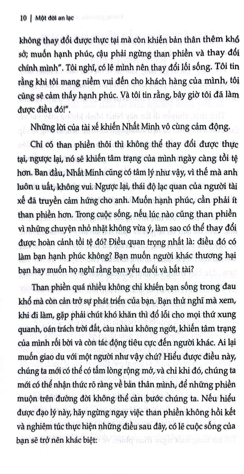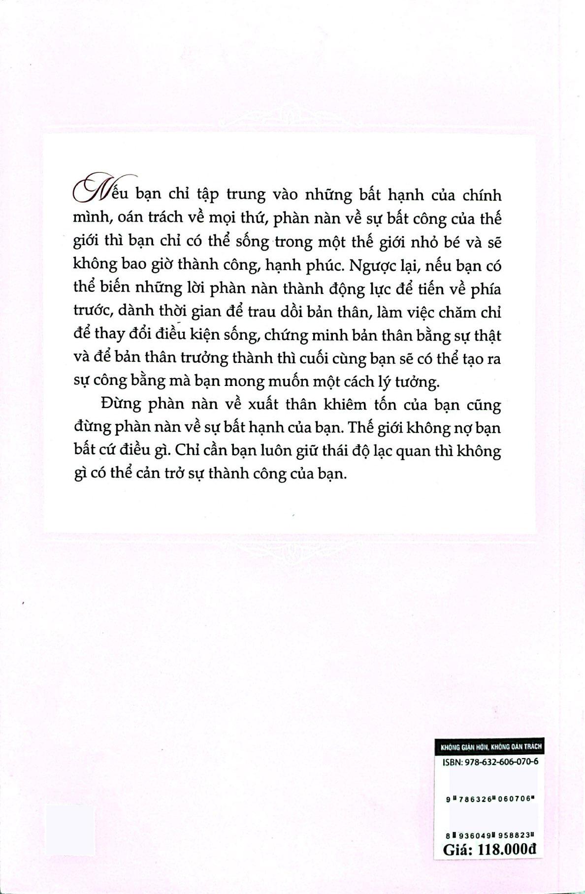 Nếu bạn chỉ tập trung vào những bất hạnh của chính m.ình, oán trách về mọi thứ, phàn nàn về sự bất công của thế giới thì bạn chỉ có thể sống trong một thế giới nhỏ bé và sẽ không bao giờ thành công, hạnh phúc. Ngược lại, nếu bạn có thể biến những lời phàn nàn thành động lực để tiến về phía trước, dành thời gian để trau dồi bản thân, làm việc chăm chỉ để thay đổi điều kiện sống, chứng minh bản thân bằng sự thật và để bản thân trưởng thành thì cuối cùng bạn sẽ có thể tạo ra sự công bằng mà bạn mong muốn một cách lý tưởng. Đừng phàn nàn về xuất thân khiêm tốn của bạn cũng đừng phàn nàn về sự bất hạnh của bạn. Thế giới không nợ bạn bất cứ điều gì. Chỉ cần bạn luôn giữ thái độ lạc quan thì không gì có thể cản trở sự thành công của bạn.