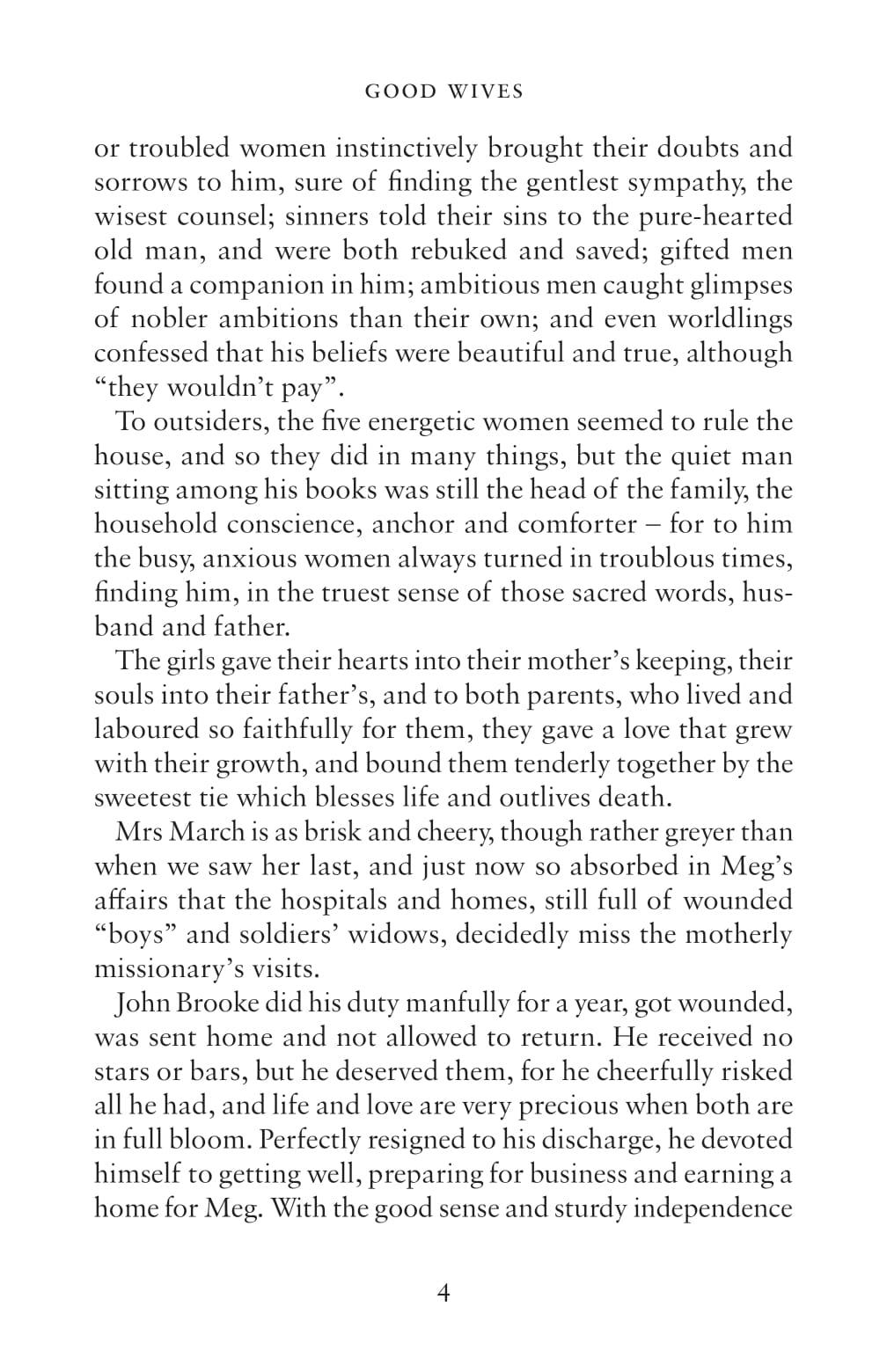 Good Wives Three years have passed since the events narrated in Little Women, and the four March sisters are approaching adulthood, with all its accompanying challenges and expectations. Meg is preparing for her wedding, Beth