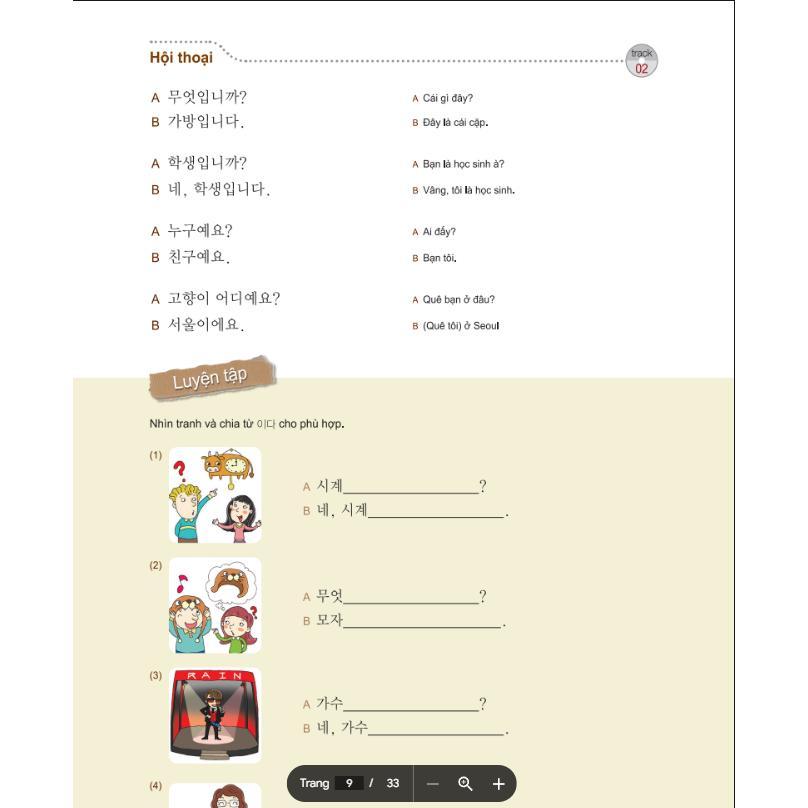 - Tổng hợp hệ thống cấu trúc ngữ pháp trình độ sơ cấp phù hợp với những người mới bắt đầu học tiếng Hàn Cuốn sách này được thiết kế hoàn toàn phù hợp với những người mới bắt đầu học tiếng Hàn. Sách gồm có 3 phần chính tổng hợp các kiến thức chính về ngữ pháp tiếng Hàn sơ cấp và thêm nhiều phần kiến thức liên quan: – Phần 1: Giới thiệu tiếng Hàn Quốc (Phần này sẽ giúp các bạn bước đầu có những hình dung về tiếng Hàn, là tiền đề để bạn học tốt môn ngoại ngữ này) – Phần 2: 24 bài học hệ thống các cấu trúc ngữ pháp phù hợp với trình độ của các bạn – Phần 3: Phụ lục (Cung cấp thêm nhiều kiến thức bổ trợ và đáp án cho các bài luyện tập ở phía trước) Mỗi bài học không chỉ giúp các bạn học được các kiến thức ngữ pháp mà còn giúp bạn biết cách sử dụng cấu trúc đó trong trường hợp thực tế. Mỗi bài học bao gồm các phần: Tìm hiểu ngữ pháp, hội thoại, luyện tập, tìm hiểu thêm, phân biệt các cấu trúc khó, ví dụ dẫn nhập. Nhờ đó các bạn mới học hoàn toàn có thể hiểu và nhớ lâu kiến thức.