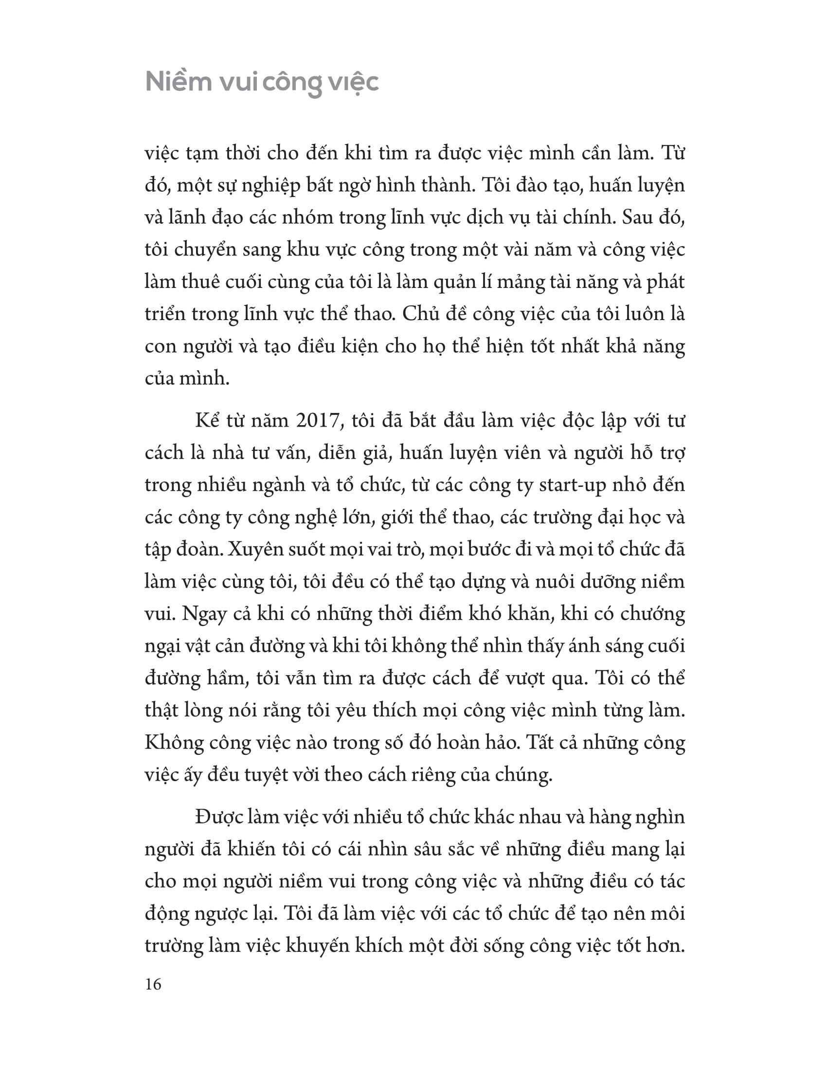- Làm sao để sử dụng bộ công cụ này hiệu quả và phù hợp đối với bản thân? "Niềm vui công việc" được chia thành 4 phần, bao gồm: Phần 1: Giới thiệu về Niềm vui công việc và Nỗi buồn công việc Phần 2: Các yếu tố Niềm vui Công việc nội tại Phần 3: Các yếu tố Niềm vui Công việc bên ngoài Phần 4: Biến Niềm vui Công việc thành hiện thực Với bộ công cụ hữu ích này, bạn có thể sử dụng theo hai cách: Bạn có thể đọc nó từ đầu đến cuối, bắt đầu với những kiến thức nền tảng và từng bước tìm hiểu những lời khuyên thiết thực - một trải nghiệm đắm chìm trọn vẹn! Bạn cũng có thể tập trung vào các phần phù hợp với nhu cầu của m.ình ngay lúc này, từ đó áp dụng vào thực tế một cách dễ dàng hơn. Với "Niềm vui công việc" - một bộ sưu tập các công cụ thực tế, được thiết kế để đưa người đọc vào một chuyến thám hiểm nhằm tìm kiếm và duy trì nhiều niềm vui hơn trong đời sống công việc của chính m.ình, bạn chắc chắn sẽ tìm thấy lại được chính m.ình, tạm biệt tình trạng "zombie" công sở, thắp lại ngọn lửa say mê và giúp cho tinh thần phấn chấn, năng động trở lại!