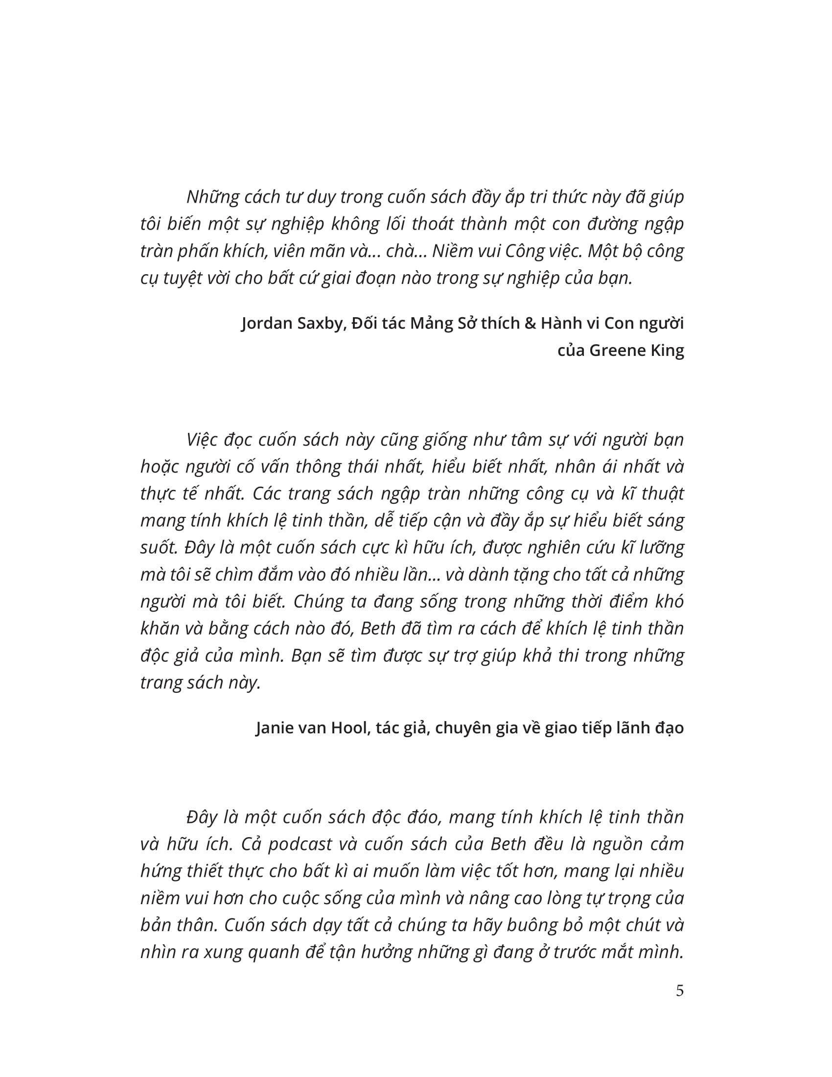 - "Niềm vui công việc" - Một bộ công cụ thực tế bạn có thể áp dụng Cuốn sách "Niềm vui công việc" là một bộ sưu tập các công cụ thực tế đã được thử nghiệm và kiểm tra mà tác giả Beth Stallwood đã thu thập qua nhiều năm làm việc với những con người đang cảm thấy chán chường và chán nản trong công việc. Cuốn sách được thiết kế để đưa bạn vào một chuyến thám hiểm nhằm tìm kiếm và duy trì nhiều niềm vui trong đời sống công sở của bạn.