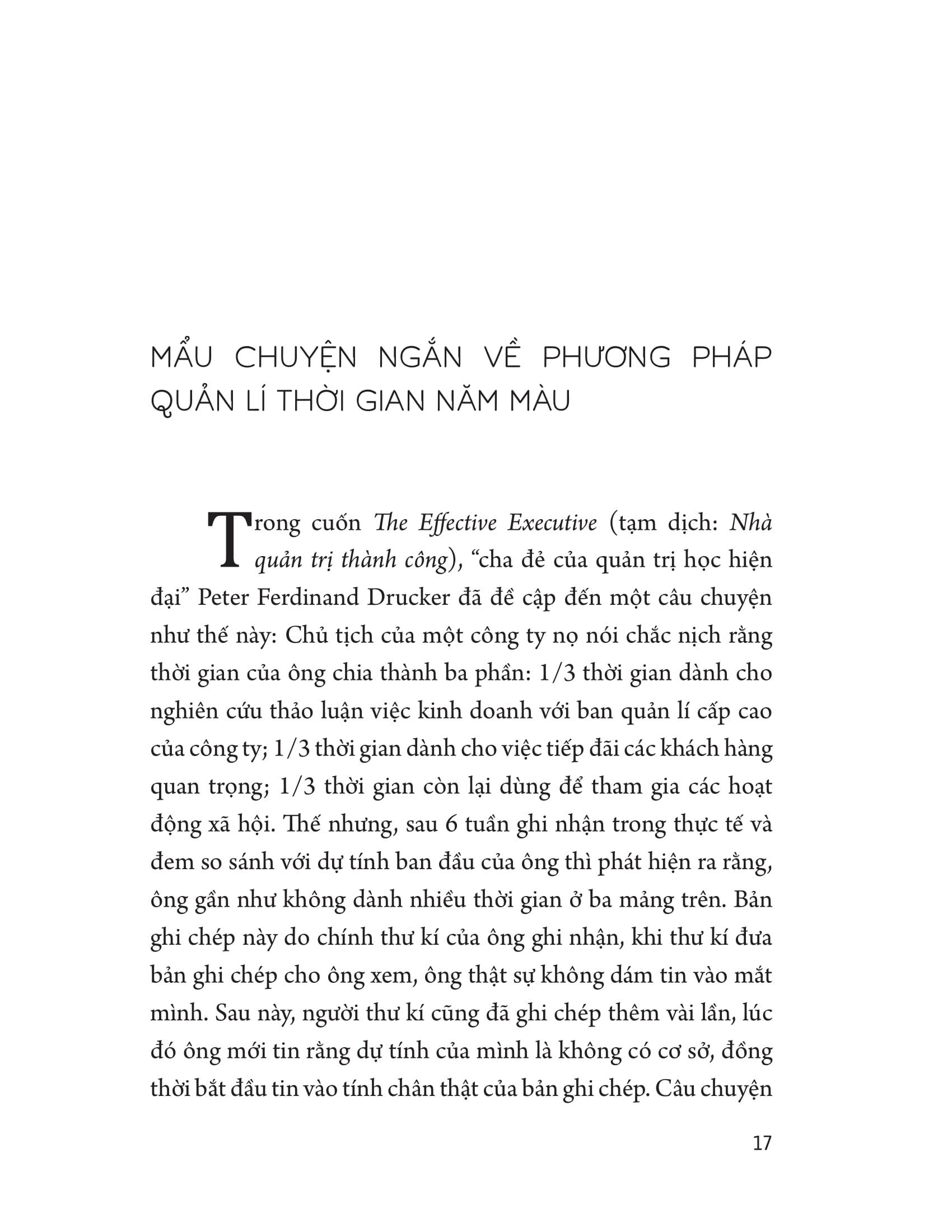 - Cấp độ thứ năm: Hình thành những thói quen nhỏ, khiến việc duy trì trở nên dễ dàng hơn. Cuốn sách này đưa ra 3 mẩu chuyện ngắn về phương pháp quản lí thời gian năm màu, 13 thực chiến quản lí thời gian năm màu, 14 cẩm nang phương pháp quản lí thời gian năm màu và 26 sơ đồ tư duy phương pháp quản lí thời gian năm màu. Trong phần Phụ lục có 11 lý thuyết quản lí thời gian thường thấy, 5 ứng dụng thường dùng để quản lí thời gian, danh mục sách tham khảo về quản lí thời gian và năm màu trong cuộc sống. Áp dụng phương pháp này vào thực tế, bạn sẽ sống một cuộc đời đầy màu sắc, cân bằng và tự do hơn!