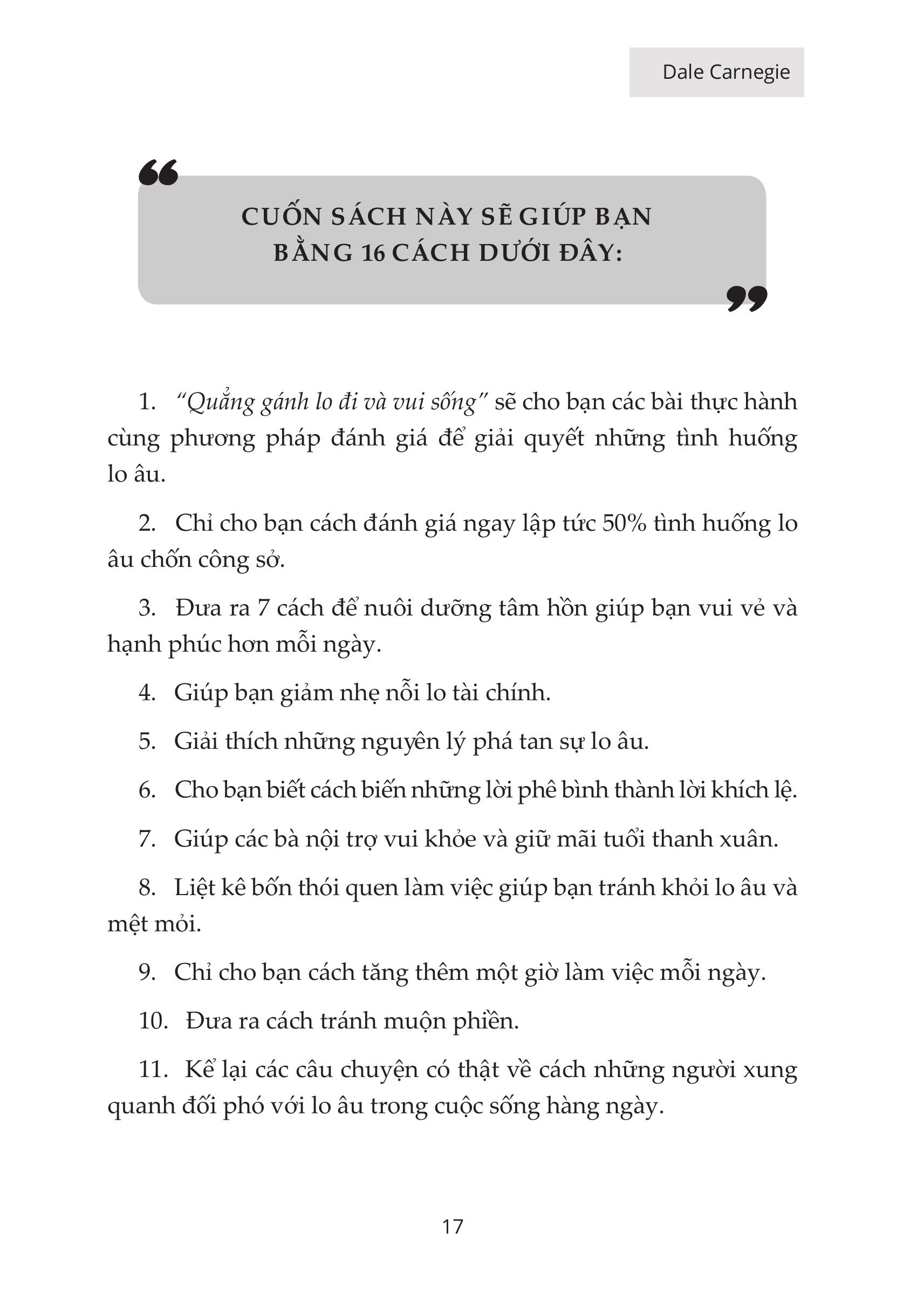 Bất kỳ ai đang sống đều sẽ có những lo lắng thường trực về học hành, công việc, những hoá đơn, chuyện nhà cửa,... Cuộc sống không dễ dàng giải thoát bạn khỏi căng thẳng, ngược lại, nếu quá lo lắng, bạn có thể mắc bệnh trầm cảm. Quẳng Gánh Lo Đi Và Vui Sống khuyên bạn hãy khóa chặt dĩ vãng và tương lai lại để sống trong cái phòng kín mít của ngày hôm nay. Mọi vấn đề đều có thể được giải quyết, chỉ cần bạn bình tĩnh và xác định đúng hành động cần làm vào đúng thời điểm.