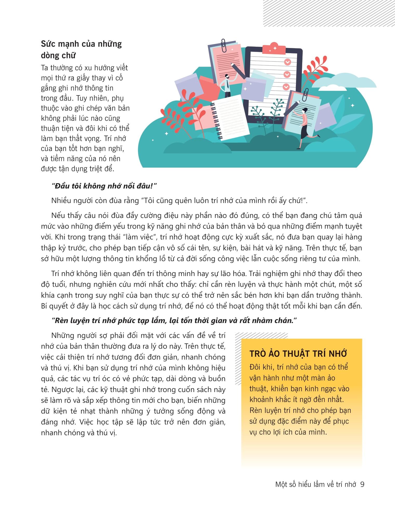 - Hiểu được trí nhớ của bản thân thay đổi như thế nào theo thời gian và bạn có thể làm gì để giữa cho tâm trí luôn khỏe mạnh khi về già Một cuốn sách dành cho mọi lứa tuổi, từ các bạn học sinh sinh viên muốn ghi nhớ kiến thức trên lớp, vượt qua kỳ thi,… cho đến các việc ứng dụng trí nhớ trong công việc hàng ngày, rèn luyện trí nhớ cả khi về già.