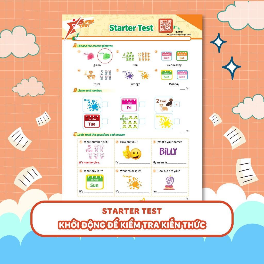 Với Bộ sách Super Test – Đề kiểm tra nhanh Tiếng Anh cho học sinh, bố mẹ sẽ giúp con tiến bộ từng ngày, tự tin với khả năng ngôn ngữ của mình khi ôn luyện Tiếng Anh bởi các bài tập về 4 kỹ năng: Nghe – Nói – Đọc – Viết được liên kết với nhau theo logic của bài học.