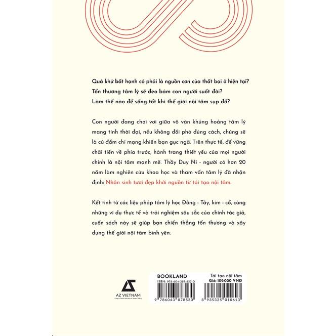 Thầy Duy Ni - người có hơn 20 năm làm nghiên cứu khoa học và tham vấn tâm lý đã nhận định: “Nhân sinh tươi đẹp khởi nguồn từ tái tạo nội tâm.” Cuốn sách này là kết tinh của các liệu pháp tâm lý học Đông - Tây, kim - cổ, cùng những ví dụ thực tế và trải nghiệm sâu sắc của chính tác giả. Nó sẽ giúp người đọc có cái nhìn chính xác và giải pháp thực tế để đối phó với các vấn đề tâm lý thường gặp như: lo lắng, sợ hãi, trầm cảm, ám ảnh cưỡng chế, Đây là một công cụ chắc chắn cần thiết để chiến thắng tổn thương và xây dựng thế giới nội tâm bình yên.