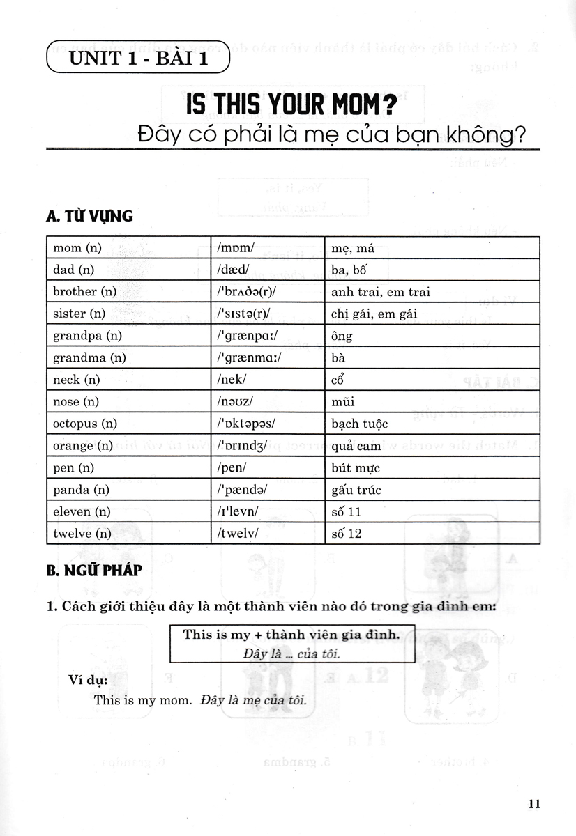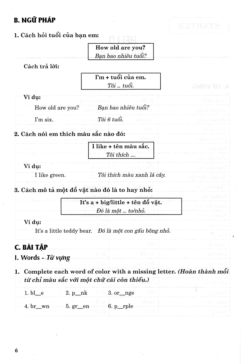 Với nội dung Từ vựng và Ngữ pháp, học sinh sẽ được ôn lại các từ vựng và mẫu câu đã học trong bài. Sau đó, các em sẽ được ứng dụng những từ vựng và mẫu câu đó thông qua các hoạt động đa dạng trong nội dung bài tập. Ví dụ nối từ với hình đúng, nhìn hình và đánh dấu chọn vào ô đúng, đọc và khoanh tròn câu đúng, nối để tạo thành câu, chọn câu trả lời đúng, sắp xếp lại các từ và viết câu hoàn chỉ
