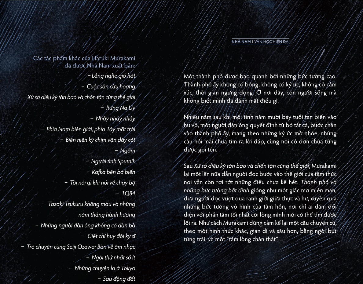 Nhà phát hành: Nhã Nam Nhà xuất bản: Hội Nhà Văn Tác giả: Haruki Murakami Dịch giả: Uyên Thiểm Số trang: 540 Kích thước: 15.5 x 24 cm   Một thành phố được bao quanh bởi những bức tường cao. Thành phố ấy không có bóng, không có ký ức, không có cảm xúc, thời gian ngưng đọng. Ở nơi đây, con người sống mà không biết mình đã đánh mất điều gì.   Nhiều năm sau khi mối tình năm mười bảy tuổi tan biến vào hư vô, một người đàn ông quyết định từ bỏ tất cả, bước chân vào thành phố ấy, mang theo những ký ức mờ nhòe, những câu hỏi mãi chưa tìm ra lời đáp, cùng nỗi cô đơn chứa từng được gọi tên.   Sau Xứ sở diệu kỳ tàn bạo và chốn tận cùng thế giới, Murakami lại một lần nữa dẫn người đọc bước vào thế giới của tâm thức nơi vẫn còn rơi rớt những điều chưa kể hết. Thành phố và những bức tường bất định giống như một giấc mơ miên man, đưa người đọc vượt qua ranh giới giữa thực và hư, xuyên qua những bức tường vô hình của tâm hồn, nơi chỉ ai dám đối diện với phần tăm tối nhất cõi lòng mình mới có thể tìm được lối ra. Như cách Murakami dũng cảm kể lại một câu chuyện cũ, theo một hình thức khác, giản dị và sâu hơn, bằng ngòi bút từng trải, và một "tấm lòng chân thật