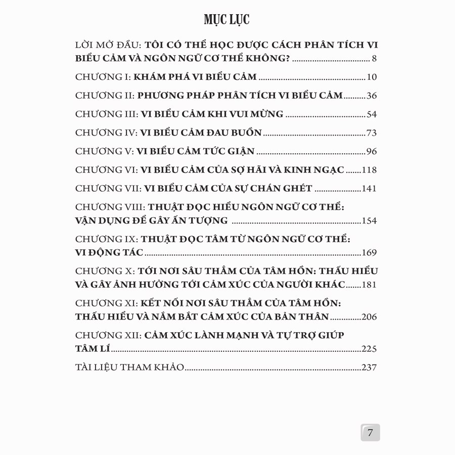 SÁCH: THÔNG ĐIỆP TỪ NHỮNG BIỂU CẢM VÀ NGÔN NGỮ CƠ THỂ Mã sản phẩm: 70 Tác giả : Kỳ Vũ Dịch giả :Nguyệt Minh NXB: NXB Thanh Niên Nhà Phát Hành: Minh Thắng Book Kích thước : 14.5x20.5 cm Năm xuất bản : 2019 Số trang : 240 Khối lượng : 250 grams Bìa : bìa mềm Có rất nhiều người hứng thú với tâm lí học nhưng không biết phải bắt đầu tìm hiểu như thế nào. Hệ thống kiến thức trong tâm lí học bao la rộng lớn, vì vậy nên dành thời gian quý báu để học các kiến thức có tính thực dụng nhất trong đó mà thôi. Hiểu được đây mong muốn của rất nhiều người, tác giả Kỷ Vũ đã cho ra đời cuốn sách Thông điệp từ những biểu cảm và ngôn ngữ cơ thể với sự kết hợp các ví dụ phong phú dùng ngôn ngữ đơn giản, dễ hiểu để trình bày những kiến thức phức tạp, phục vụ những nhu cầu ứng dụng tâm lí học vào đời sống. Đầu tiên, hãy tìm hiểu qua về tác giả Kỷ Vũ Kỷ Vũ là giảng viên huấn luyện và bồi dưỡng cố vấn tâm lí quốc gia, chủ biên của tài liệu đào tạo sát hạch cố vấn tâm lí quốc gia. Tác giả còn là một bác sĩ Tâm lí học trong quân đội, một bác sĩ tâm lí giàu kinh nghiệm, nhà nghiên cứu tâm lí học hành vi. Ông có sở trường vận dụng sự quan sát tỉ mỉ và độc đáo để tiến hành phân tích, khám phá những bí mật ẩn giấu trong những đầu mối “phi ngôn ngữ”, đi sâu vào tâm hồn con người. Cuốn sách Thông điệp từ những biểu cảm và ngôn ngữ cơ thể là cuốn sách chất chứa rất nhiều kinh nghiệm thực tiễn của ông về tâm lí học. Vì vậy, đây là một cuốn sách rất hữu ích cho những ai đang muốn tìm hiểu về lĩnh vực này. Thực ra ai cũng có thể học được những kiến thức này và một khi đã nắm được chúng, chúng ta sẽ có được những lợi ích to lớn. Ứng dụng tâm lí học: Phân tích vi biểu cảm và thuật đọc tâm từ ngôn ngữ cơ thể Phân tích vi biểu cảm và thuật đọc tâm từ ngôn ngữ cơ thể là một trong những kĩ năng từ ứng dụng trong tâm lí học. Sách được chia thành bốn phần: 1. Phần thứ nhất (Chương I, Chương II) giới thiệu kiến thức và phương pháp phân tích vi biểu cảm. 2. Phần thứ hai (Chương III đến Chương VII) mô tả các đặc điểm nét mặt và ngôn ngữ cơ thể với những trạng thái cảm xúc khác nhau. 3. Phần thứ ba (Chương VIII, Chương IX) tập trung phân tích hàm nghĩa của ngôn ngữ cơ thể và phương pháp vận dụng chúng. 4. Phần thứ tư (Chương X đến Chương XII) đi sâu vào tìm hiểu các vấn đề, đặc điểm của nhân tâm, nhân tính và hướng giải quyết chúng. Ngoài việc phát hiện ra nói dối trong tư pháp, phân tích vi biểu cảm và đọc ngôn ngữ cơ thể còn có phạm vi ứng dụng tương đối rộng, ví dụ trong các lĩnh vực, tình huống như: hội đàm chính trị, đàm phán kinh doanh, nghiên cứu thần kinh học, phỏng vấn tuyển dụng và giao tiếp xã hội. Tất cả những người làm các công việc trên và những ai quan tâm đến thuật đọc tâm đều có thể sử dụng cuốn sách này như một giáo trình sơ cấp để học tập, tham khảo. Phân tích vi biểu cảm được mọi người biết đến chính là nhờ bộ phim truyền hình Lie to me của Mĩ. Trong phim, năng lực nhìn thấu một cách chuẩn xác nội tâm người khác thông