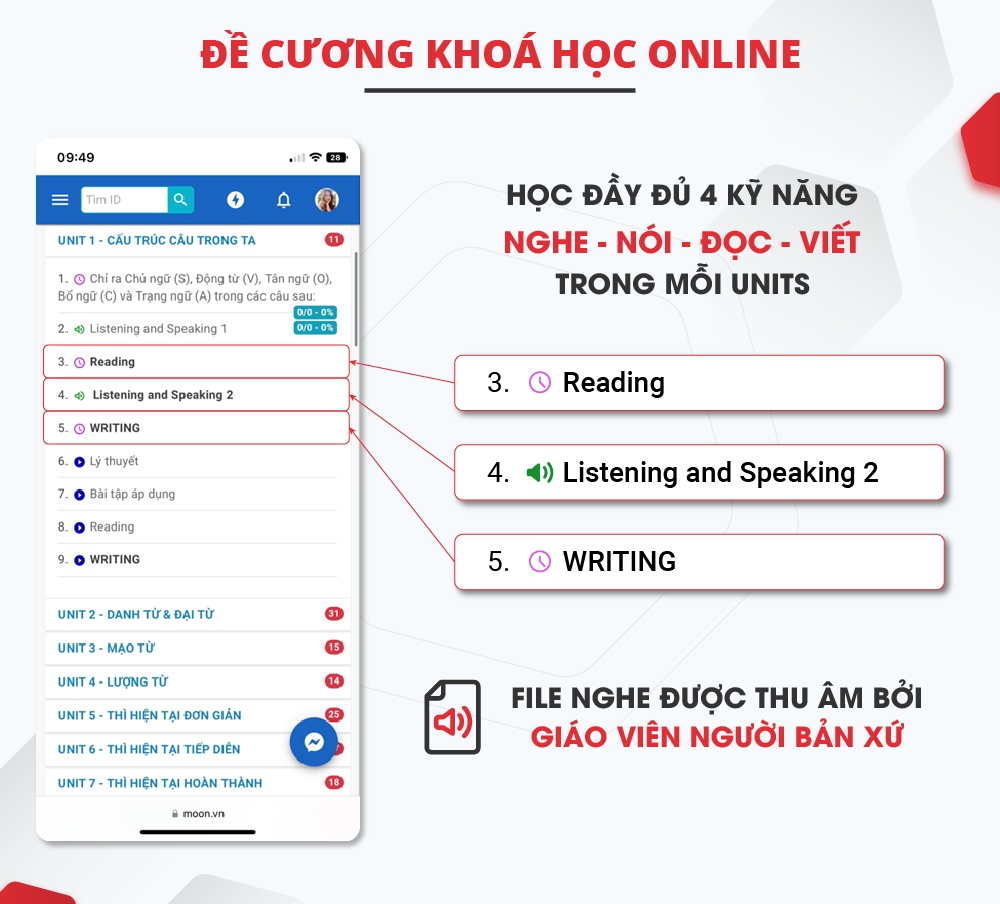 - Đầy đủ 4 kỹ năng: Nghe- Nói - Đọc- Viết