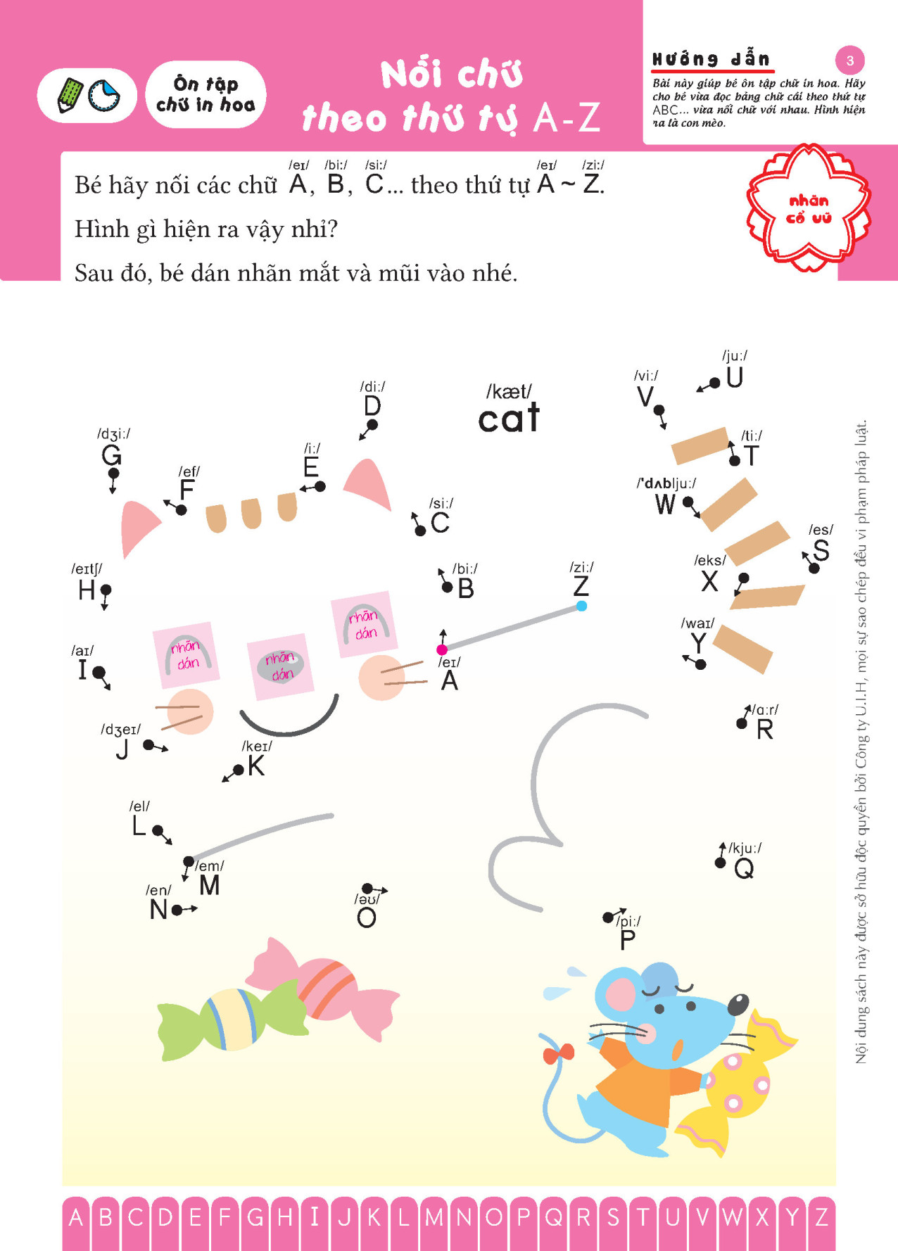 ☆ Chữ cái abc (4~6 tuổi) hướng đến đối tượng là những trẻ muốn tìm hiểu thêm về tiếng Anh sau khi đã thuộc được những chữ cái in hoa. Trẻ được làm quen với chữ in thường (từ a đến z) và luyện tập ghi nhớ kỹ mặt chữ qua các bài tập dán nhãn phù hợp giúp phân biệt chữ in thường và in hoa. Nửa sau quyển sách là những bài học từ vựng tiếng Anh với chủ đề màu sắc, động vật, con số. Trẻ được học tập các từ vựng tiếng Anh một cách thoải mái qua những dạng bài có lồng ghép dán nhãn, nối đường thẳng.