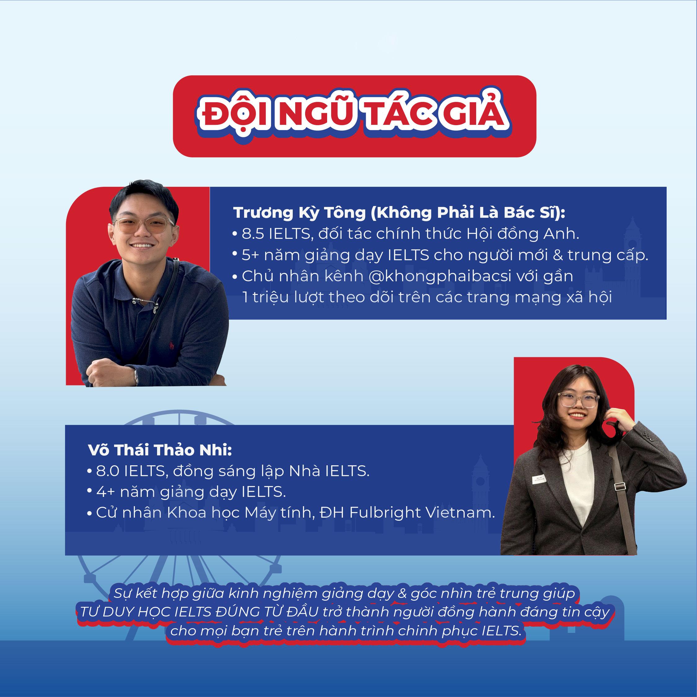 - Các bạn muốn nâng band IELTS nhưng gặp khó khăn trong việc nâng điểm vì thiếu tư duy đúng và phương pháp học phù hợp. Về tác giả: Trương Kỳ Tông, hay còn được biết đến rộng rãi trong cộng đồng học IELTS với biệt danh “Không Phải Là Bác Sĩ”, gây ấn tượng mạnh bởi loạt thành tích khủng: cựu học sinh Chuyên Trần Đại Nghĩa, tốt nghiệp THPT Grand Prairie Collegiate Institute (Mỹ) vào năm 16 tuổi, đạt số điểm gần như tuyệt đối trong kỳ thi IELTS với band 8.5, đối tác chính thức của Hội đồng Anh, sở hữu 5 năm giảng dạy IELTS cho người mới và trung cấp. Trong lần ra mắt này, Kỳ Tông kết hợp cùng tác giả Võ Thái Thảo Nhi - cựu học sinh Chuyên Lê Hồng Phong, để biên soạn nên cuốn sách “Tư Duy Học IELTS Đúng Từ Đầu”. Thảo Nhi cũng là đồng sáng lập Nhà IELTS cùng Kỳ Tông, với loạt thành tích có thể kế đến như IELTS 8.0, 4 năm kinh nghiệm dạy tiếng Anh, cử nhân khoa Khoa học máy tính, ngành phụ Toán Ứng dụng trường ĐH Fulbright Vietnam. Đánh giá từ chuyên gia: Nếu biết đến Tư duy học IELTS đúng từ đầu sớm hơn, chắc chắn ngày xưa m.ình đã cải thiện điểm nhanh hơn từ mức 4.0. Cuốn sách chỉ ra những thói quen sai phổ biến và đưa ra cách tiếp cận tiếng Anh tự nhiên như người bản xứ. Đây là điều không dễ làm được nếu chỉ học theo cách thông thường, nhưng sách đã giúp người học từng bước sửa những "tật khó bỏ" đó. Với sự thực tế và hài hước, cuốn sách khiến việc luyện IELTS trở nên dễ tiếp cận và bớt áp lực hơn nhiều. - Bùi Thành Việt - IELTS 8.5, tác giả bộ sách IELTS WRITING JOURNEY With 15 years of experience teaching IELTS, I find this book refreshingly clear in how it challenges old learning habits and reframes the path forward. It makes IELTS preparation genuinely approachable and helps learners build the right foundations from the start. I especially value the dedicated section on concentration - practical strategies to cultivate focus and apply it effectively when working through IELTS practice tests. These insights are concrete, realistic, and too often missing from exam guides. If you’re stuck and struggling to raise your band score, this book could be the reset you need. - Jack Zissler (@) - Cựu giám khảo Ielts | Giám gốc 195Global JSC