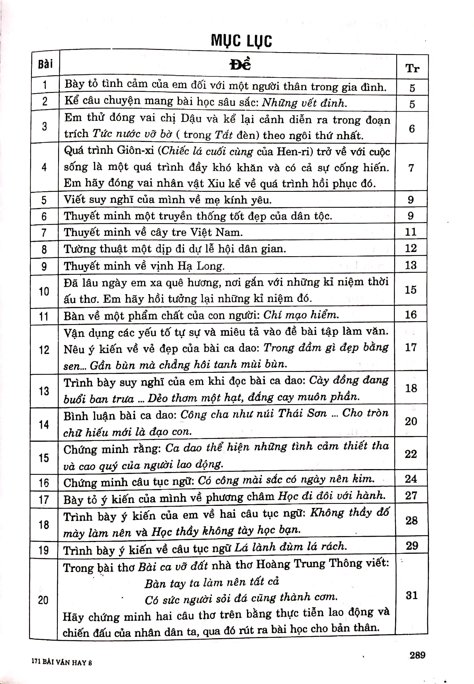 Sáchđược biên soạn theo sách giáo khoa Ngữ Văn 8 – Chương trình mới nhất của Bộ Giáo dục và Đào tạo. Đây là tập hợp 171 bài văn hay được chúng tôi biên soạn và tuyển chọn. Trong cuốn sách, ngoài những bài văn hoàn chỉnh, chúng tôi còn biên soạn một số dàn ý chi tiết để các em có thể căn cứ vào đó viết bài theo văn phong và cách cảm nhận của m.ình.