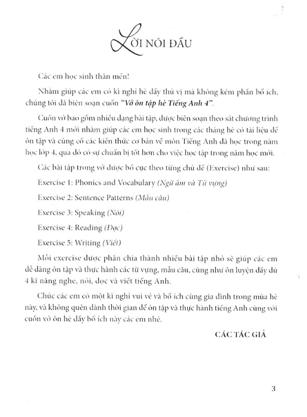 Chúc các em có một kì nghỉ vui vẻ và bổ ích cùng gia đình trong mùa hè nảy, và không quên dành thời gian để ôn tập và thực hành tiếng Anh cùng với cuốn vở ôn hệ dãy bổ ích này các em nhé.