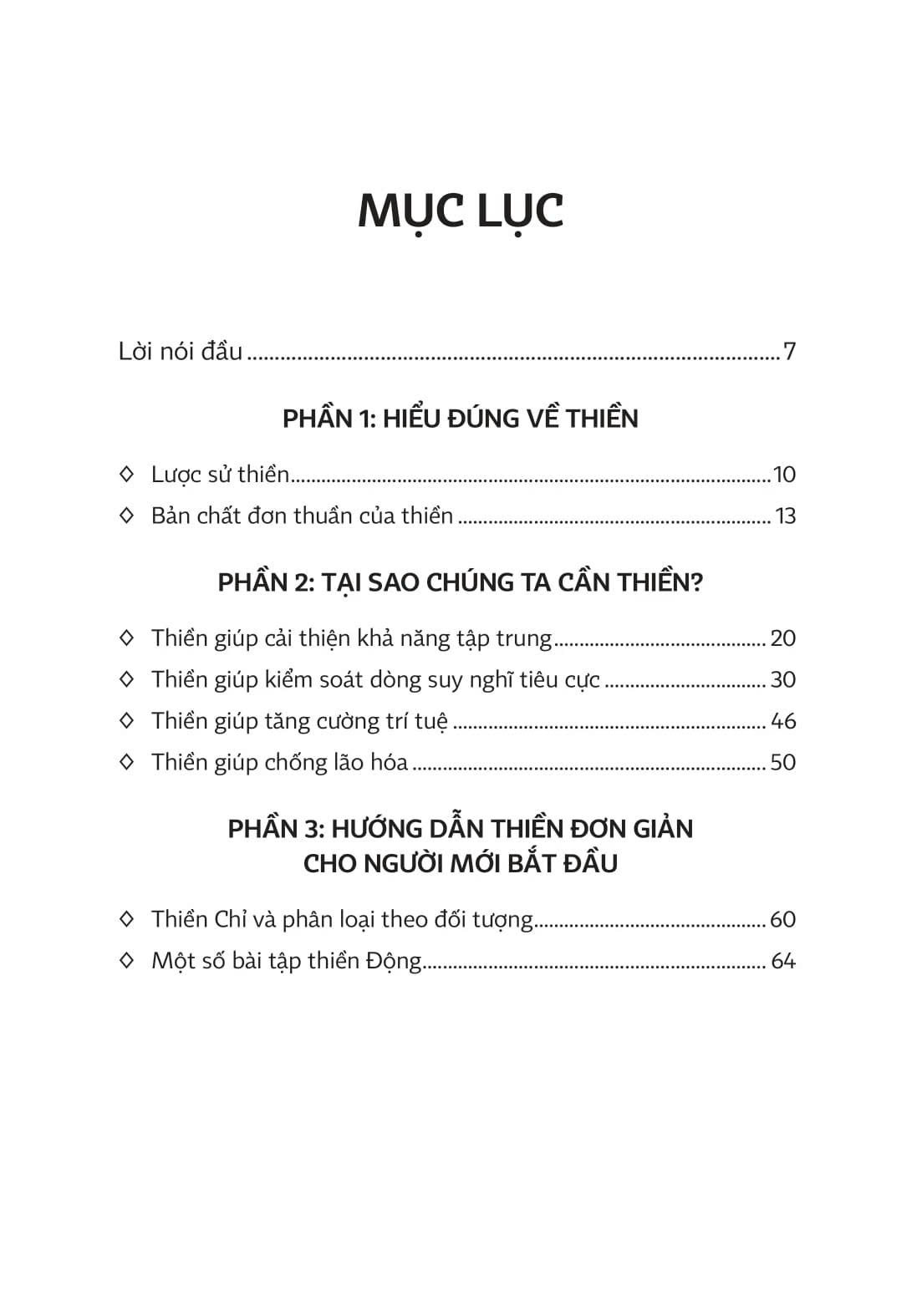 Cuốn sách này sẽ giúp bạn hiểu rằng thiền không phải là một sự thực hành mang tính tôn giáo mà là một loại hình thể dục cho tâm trí. Qua các nghiên cứu khoa học, thiền đã được chứng minh là có những tác động tích cực đến sức khỏe tinh thần và thể chất. Nó không chỉ giúp giảm căng thẳng, lo âu mà còn cải thiện khả năng tập trung và trí thông minh của chúng ta. Không những vậy, những phát hiện khoa học mới đây cho thấy thiền còn có thể giúp chống lão hóa.