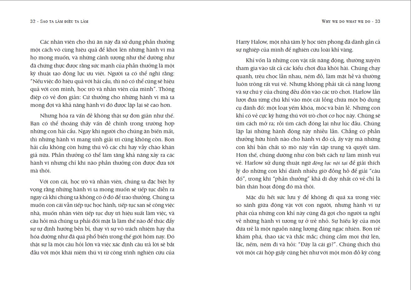 Có nhiều hiểu lầm về những thứ có thể tạo động lực cho hành vi con người, trong đó hai hiểu lầm cơ bản nhất là phần thưởng và hình phạt. Hình phạt hiển nhiên là thứ có tính kiểm soát, và vì vậy nó làm xói mòn động lực. Nhưng trái với suy nghĩ của nhiều người, phần thưởng là động lực bên ngoài, và nó cũng làm suy yếu động lực nội tại – sức sống, sự tự nguyện, tính chân thật và hiếu kỳ vốn nằm trong bản chất của con người.