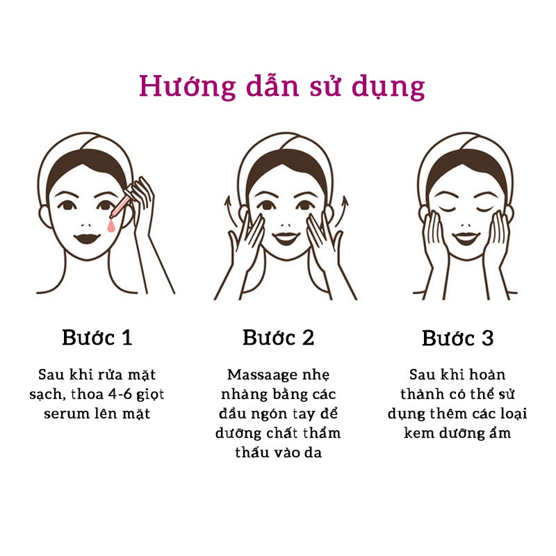 • Hướng dẫn sử dụng: Làm sạch da bằng sữa rửa mặt hoặc nước ấm, lau khô, lấy một lượng serum vừa đủ chấm lên 5 điểm: trán, mũi, 2 má và cằm. Massage nhẹ nhàng cho đều để hoạt chất thẩm thấu vào da. Ngày sử dụng 2 lần sáng và tối. 99% hiệu quả sau 7 ngày sử dụng với làn da trắng hồng tự nhiên.