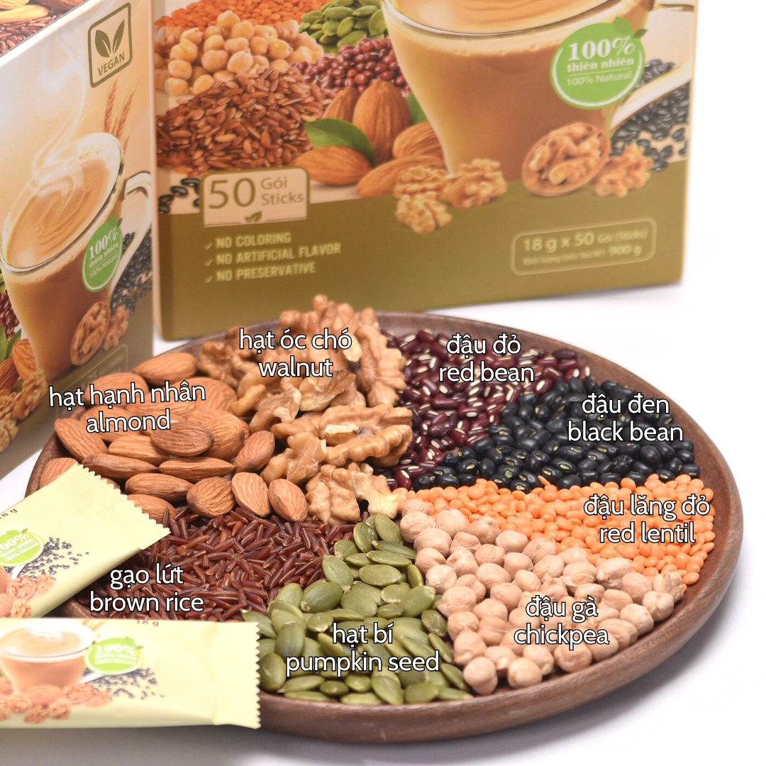 THÀNH PHẦN:Hạt sen luôn tim, mè đen, đậu đen xanh lòng, đậu đỏ, đậu xanh, đậu cút, đậu ván, đậu nành, gạo huyết rồngCÔNG DỤNG:Tăng cân, giảm cân, cho trẻ ăn dặm, cung cấp vitamin,