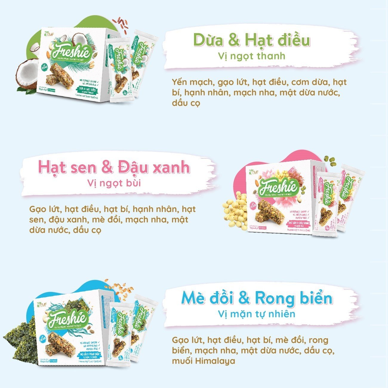 “You’re Fresh – You’re The Best” -> Thanh Hạt Dinh Dưỡng Freshie của TMF mang đến nguồn năng lượng tươi mới, khi ăn thanh Freshie bạn sẽ cảm thấy như được tiếp sức trẻ năng động, tự tin, sáng tạo để học tập, làm việc và trở thành “the best version” - phiên bản tốt nhất của chính mình.