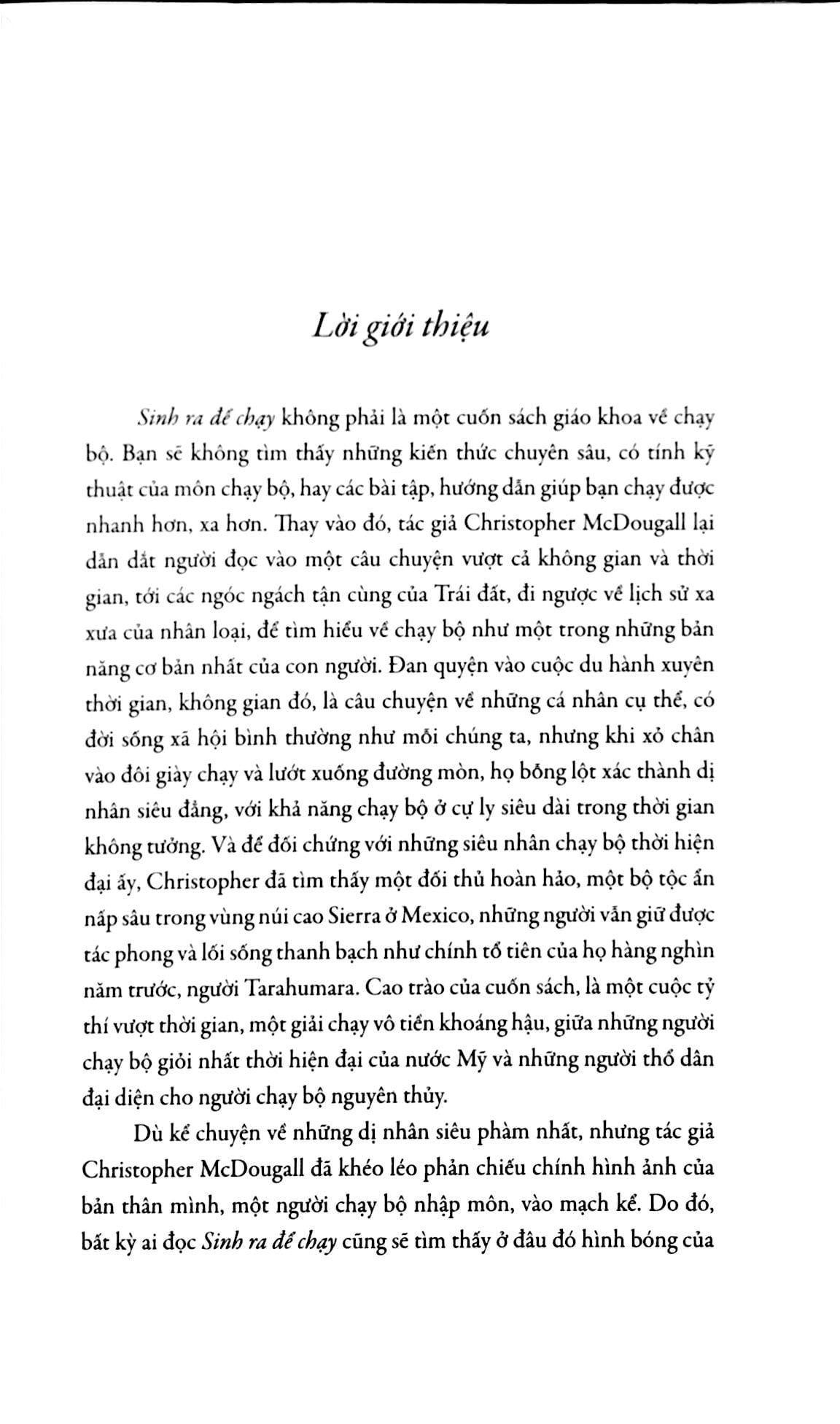 Sinh ra để chạy không phải là một cuốn sách giáo khoa về chạy bộ. Bạn sẽ không tìm thấy những kiến thức chuyên sâu, có tính kỹ thuật của môn chạy bộ, hay các bài tập, hướng dẫn giúp bạn chạy được nhanh hơn, xa hơn. Thay vào đó, tác giả Christopher McDougall lại dẫn dắt người đọc vào một câu chuyện vượt cả không gian và thời gian, tới các ngóc ngách tận cùng của Trái đất, đi ngược về lịch sử xa xưa của nhân loại, để tìm hiểu về chạy bộ như một trong những bản năng cơ bản nhất của con người. Đan quyện vào cuộc du hành xuyên thời gian, không gian đó, là câu chuyện về những cá nhân cụ thể, có đời sống xã hội bình thường như mỗi chúng ta, nhưng khi xỏ chân vào đôi giày chạy và lướt xuống đường mòn, họ bỗng lột xác thành dị nhân siêu đẳng, với khả năng chạy bộ ở cự ly siêu dài trong thời gian không tưởng. Và để đối chứng với những siêu nhân chạy bộ thời hiện đại ấy, Christopher đã tìm thấy một đối thủ hoàn hảo, một bộ tộc ẩn nấp sâu trong vùng núi cao Sierra ở Mexico, những người vẫn giữ được tác phong và lối sống thanh bạch như chính tổ tiên của họ hàng nghìn năm trước, người Tarahumara. Cao trào của cuốn sách, là một cuộc tỷ thí vượt thời gian, một giải chạy vô tiền khoáng hậu, giữa những người chạy bộ giỏi nhất thời hiện đại của nước Mỹ và những người thổ dân đại diện cho người chạy bộ nguyên thủy.