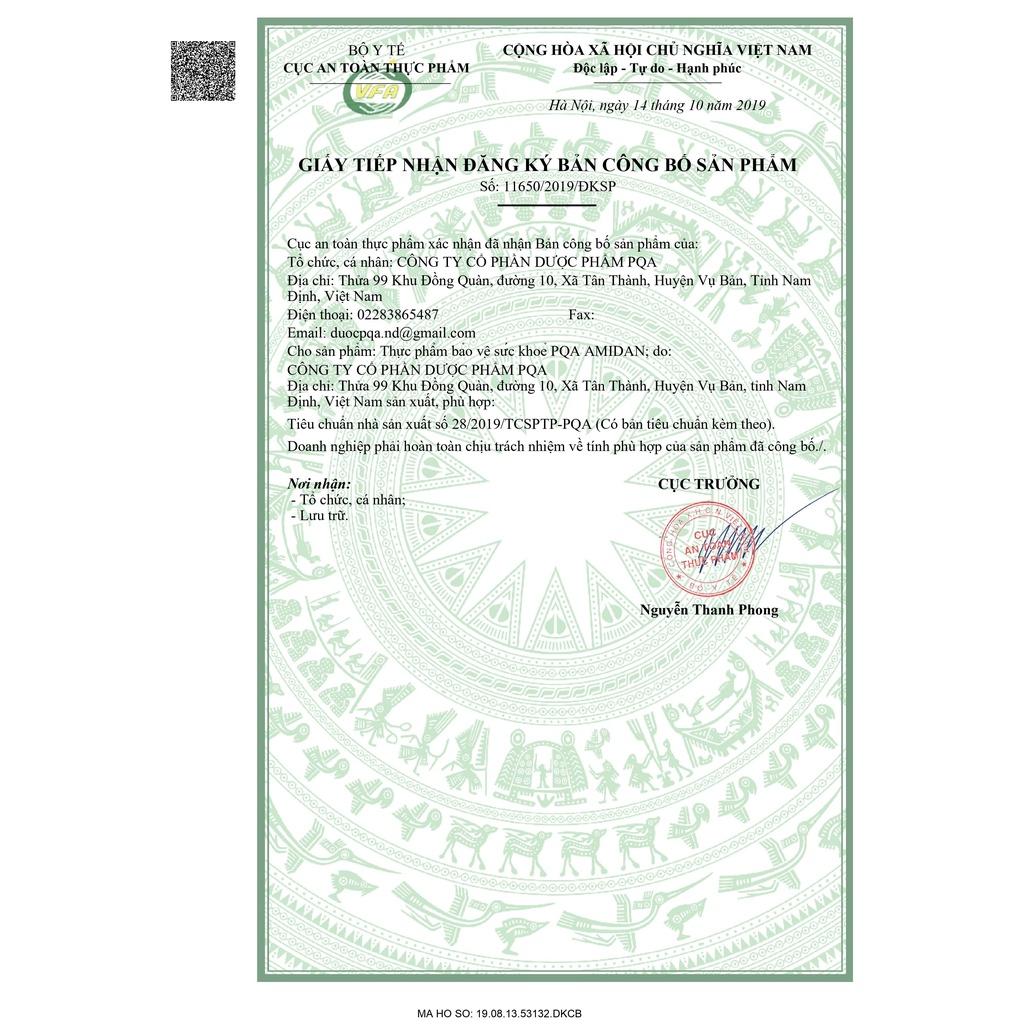 - Địa chỉ sản xuất: Công ty Cổ phần Dược phẩm PQA. Thửa 99, Khu Đồng Quàn, Xã Tân Thành, Huyện Vụ Bản, Tỉnh Nam Định. THÀNH PHẦN: