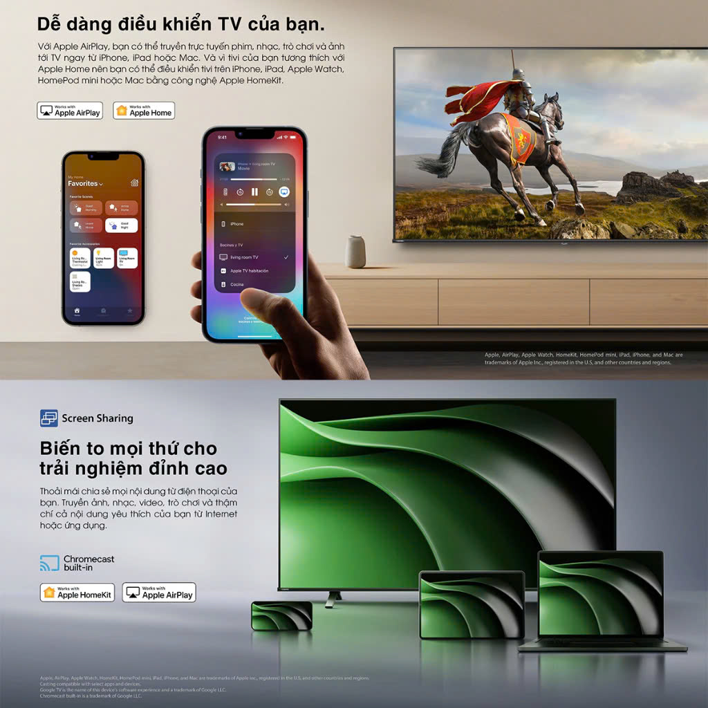 - Chiếu hình từ điện thoại lên TV: Airplay 2, DLNA, Miracast, Content sharing