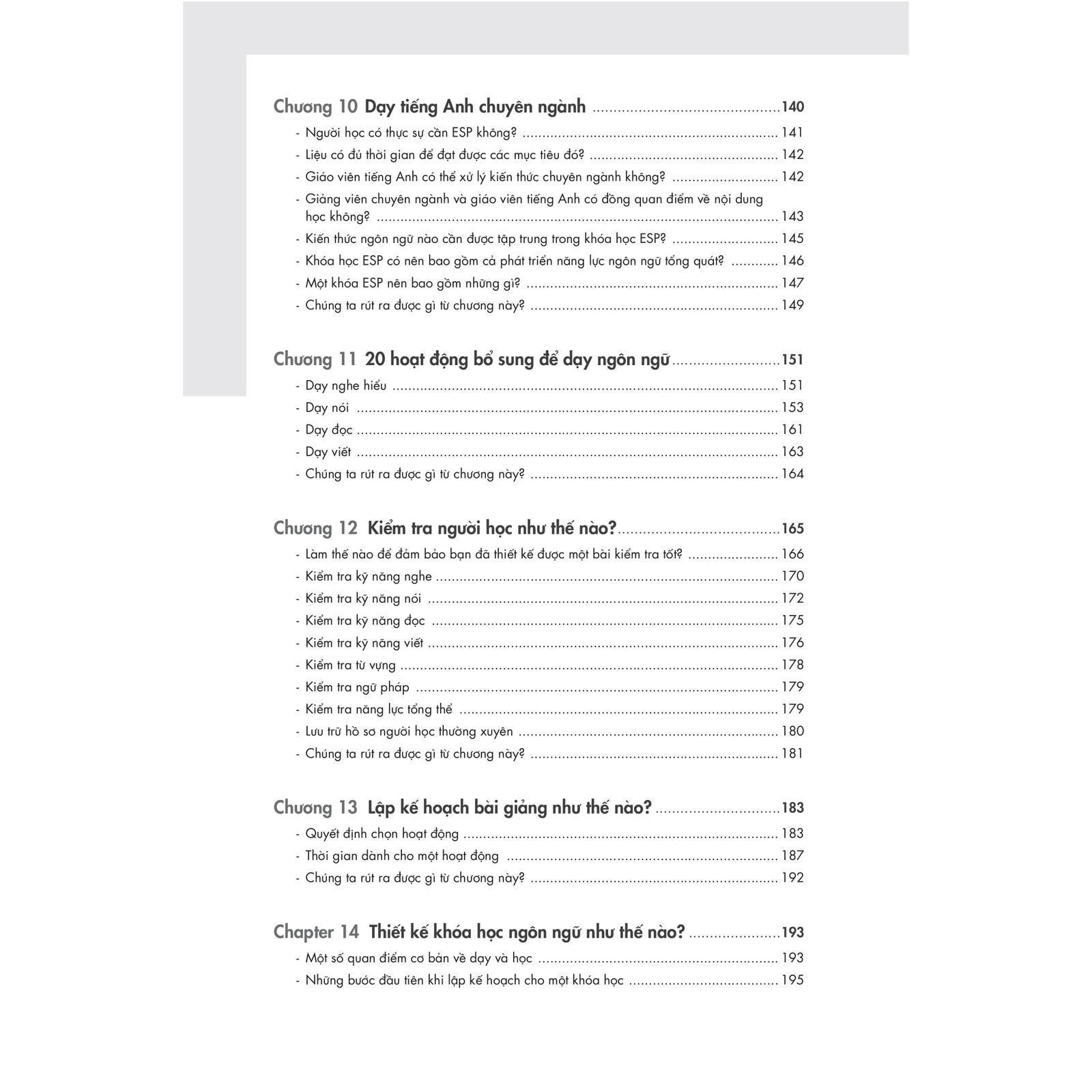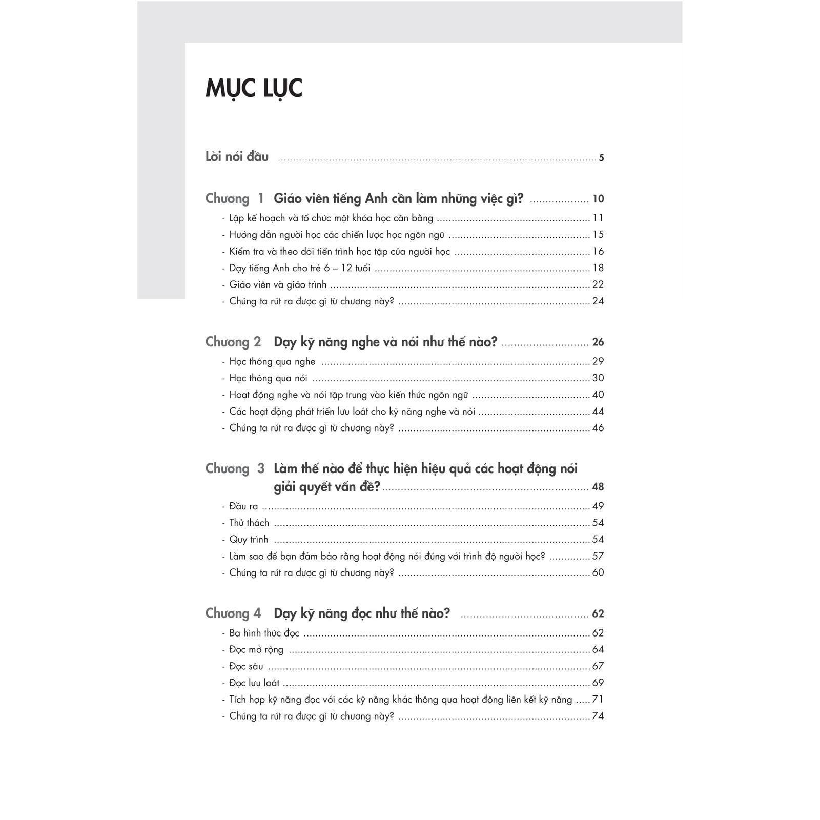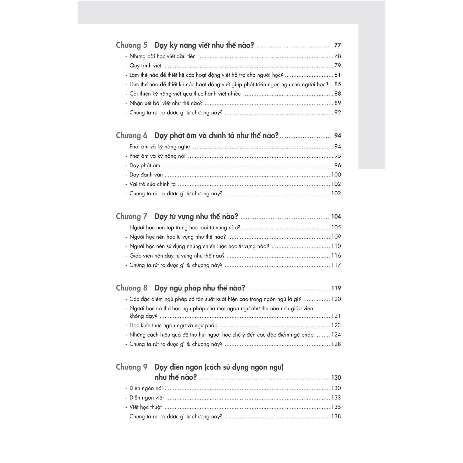 • Chiến lược xử lý các thách thức trong lớp học như sĩ số đông, học sinh thiếu động lực, trình độ không đồng đều và hành vi chưa phù hợp. Với những hướng dẫn giảng dạy thiết thực và dễ áp dụng, cuốn sách sẽ giúp giáo viên nhanh chóng triển khai những thay đổi cần thiết để nâng cao hiệu quả giảng dạy trên lớp, đồng thời giải quyết các thách thức thực tế khi dạy EFL. Lối viết rõ ràng, trực diện, hạn chế biệt ngữ chuyên ngành khiến những lý thuyết và kiến thức chuyên môn trở nên đơn giản, dễ hiểu và dễ tiếp cận đối với giáo viên ở mọi trình độ. Nội dung sách Chương 1: Giáo viên tiếng Anh cần làm những việc gì? Chương 2: Dạy kỹ năng nghe và nói như thế nào? Chương 3: Làm thế nào để thực hiện hiệu quả các hoạt động nói giải quyết vấn đề? Chương 4: Dạy kỹ năng đọc như thế nào? Chương 5: Dạy kỹ năng viết như thế nào? Chương 6: Dạy phát âm và chính tả như thế nào? Chương 7: Dạy từ vựng như thế nào? Chương 8: Dạy ngữ pháp như thế nào? Chương 9: Dạy diễn ngôn (cách sử dụng ngôn ngữ) như thế nào? Chương 10: Dạy tiếng Anh chuyên ngành Chương 11: 20 hoạt động bổ sung để dạy ngôn ngữ Chương 12: Kiểm tra người học như thế nào? Chương 13: Lập kế hoạch bài giảng như thế nào? Chương 14: Thiết kế khóa học ngôn ngữ như thế nào? Chương 15: Xử lý những vấn đề thường gặp trong dạy học như thế nào? Chương 16: Quản lý lớp học như thế nào? Chương 17: Làm thế nào để trở thành giáo viên tiếng Anh tốt hơn? Thông tin tác giả Tác giả Paul Nation là chuyên gia hàng đầu về giảng dạy tiếng Anh với hơn 40 năm kinh nghiệm đào tạo giáo viên tại nhiều quốc gia. Ông đã có nhiều đóng góp quan trọng trong lĩnh vực giảng dạy từ vựng, phương pháp giảng dạy ngôn ngữ và thiết kế chương trình học. Các tài nguyên miễn phí do ông cung cấp trên trang web cá nhân là nguồn tham khảo quý giá dành cho mọi giáo viên tiếng Anh.