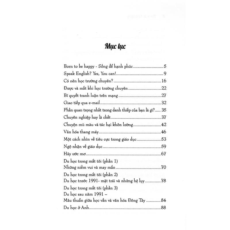 Sống Để Hạnh Phúc Cuốn sách là một chuỗi những cuộc trò chuyện giản dị của cô Nguyễn Hoàng Ánh về nỗi bất an của xã hội này: Trăn trở làm người, tìm ra được giá trị của bản thân, và mục đích chúng ta sống! Đây là những chia sẻ hết sức hữu ích dành cho các bạn trẻ và bậc làm cha mẹ, giúp chúng ta trả lời các câu hỏi: -Có nên học trường chuyên? -Chúng ta có thực sự đặc biệt không? -Thế nào là học giỏi, thế nào là thành công? -Làm giáo viên sướng hay khổ? -Vì sao đi du học? -Con cái chúng ta có thực sự có quyền sống hay không? Ta mong đợi và gửi gắm rất nhiều vào giáo dục Việt Nam, nhưng chúng ta cũng buộc phải tìm cách tự trả lời những câu hỏi trước cánh cửa cuộc đời. Du học, bằng cấp, niềm say mê, ước mơ trên ghế giảng đường, cuộc sống náo nhiệt từ Face book và tâm hồn cô quạnh của giới trẻ… Mỗi bài viết trong Born to be happy đều có khả năng khơi gợi bạn tự tìm ra nhiều cách trả lời khác nhau cho cuộc sống phía trước! Tác giả Nguyễn Hoàng Ánh kêu gọi giới trẻ ước mơ, và băn khoăn về những vị phụ huynh mãi không chịu trưởng thành. Cuộc sống học đường trong cuốn sách thực ra là một hành trình tự định vị bản thân, dũng cảm trải nghiệm sống, không ngừng mơ ước của tác giả. Tác giả Nguyễn Hoàng Ánh được hàng chục ngàn sinh viên ĐH Ngoại Thương yêu quý, cũng là người dẫn dắt, tạo cảm hứng, khích lệ rất nhiều bạn trẻ vững tin vào cách mình sống và mình cống hiến. Đọc sách và dũng cảm lên, vì chúng ta vốn sinh ra để sống hạnh phúc! (Nhà văn Trang Hạ) Tên Nhà Cung Cấp Alpha Books Tác giả Nguyễn Hoàng Ánh NXB NXB Hồng Đức Năm XB 02-2017 Số trang 220 Hình thức Bìa Mềm Sản phẩm bán chạy nhất Top 100 sản phẩm Kỹ năng sống bán chạy của tháng