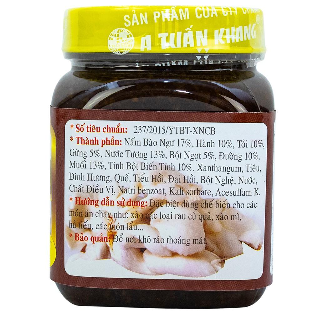 - Thành phần:Nấm bào ngư, hành, gừng, nước tương, bột ngọt, đường, muối, tinh bột biến tính, tiêu, đinh hương, quế, tiểu hồi, đại hồi, bột nghệ, nướ