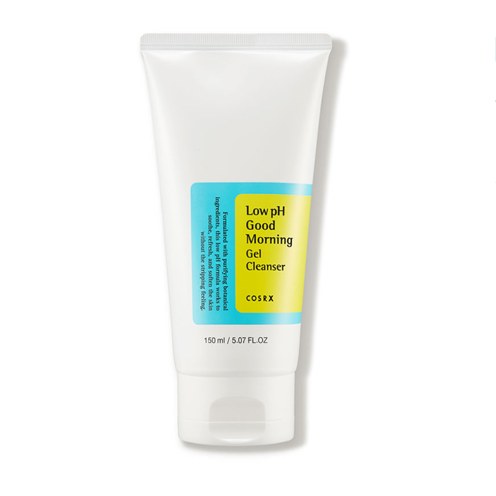 - Cosrx Low pH Good Morning Gel Cleanser là sữa rửa mặt dạng gel với độ pH 5.3 giúp làm sạch bề mặt da mà không khiến da bị khô hoặc căng. Đặc biệt dòng này có khả năng tẩy trang khá tốt. Sản phẩm dùng được cho cả sáng và tối.