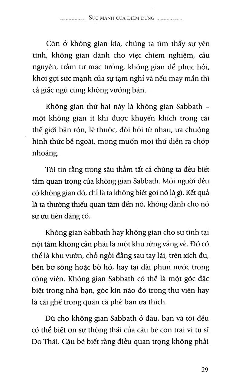 Sức Mạnh Của Điểm Dừng (Tái Bản) "Tôi ngồi xuống để đọc quyển sách này. Tôi đã phải đọc nó, và chỉ có ngày cuối tuần để thực hiện việc ấy. Đó là nhiệm vụ trong danh sách những việc cần làm của tôi. Trong vòng 10 phút đọc sách, điều gì đó đã xảy ra. Nhiệm vụ đã trở thành trải nghiệm. Tôi nhận thấy mình đã giảm nhiệt độ lại, cảm nhận được hơi ấm của ngọn lửa từ sưởi, cảm thấy thoải mái khi được cuộn mình trong chiếc chăn bông, lắng nghe tiếng tích tắc của chiếc đồng hồì vậy bạn hãy tự trao cho mình món quà, đó là tìm đọc cuốn sách này." - Kathy Cleveland Bull, người dẫn chương trình radio Fromthe Inside Out -