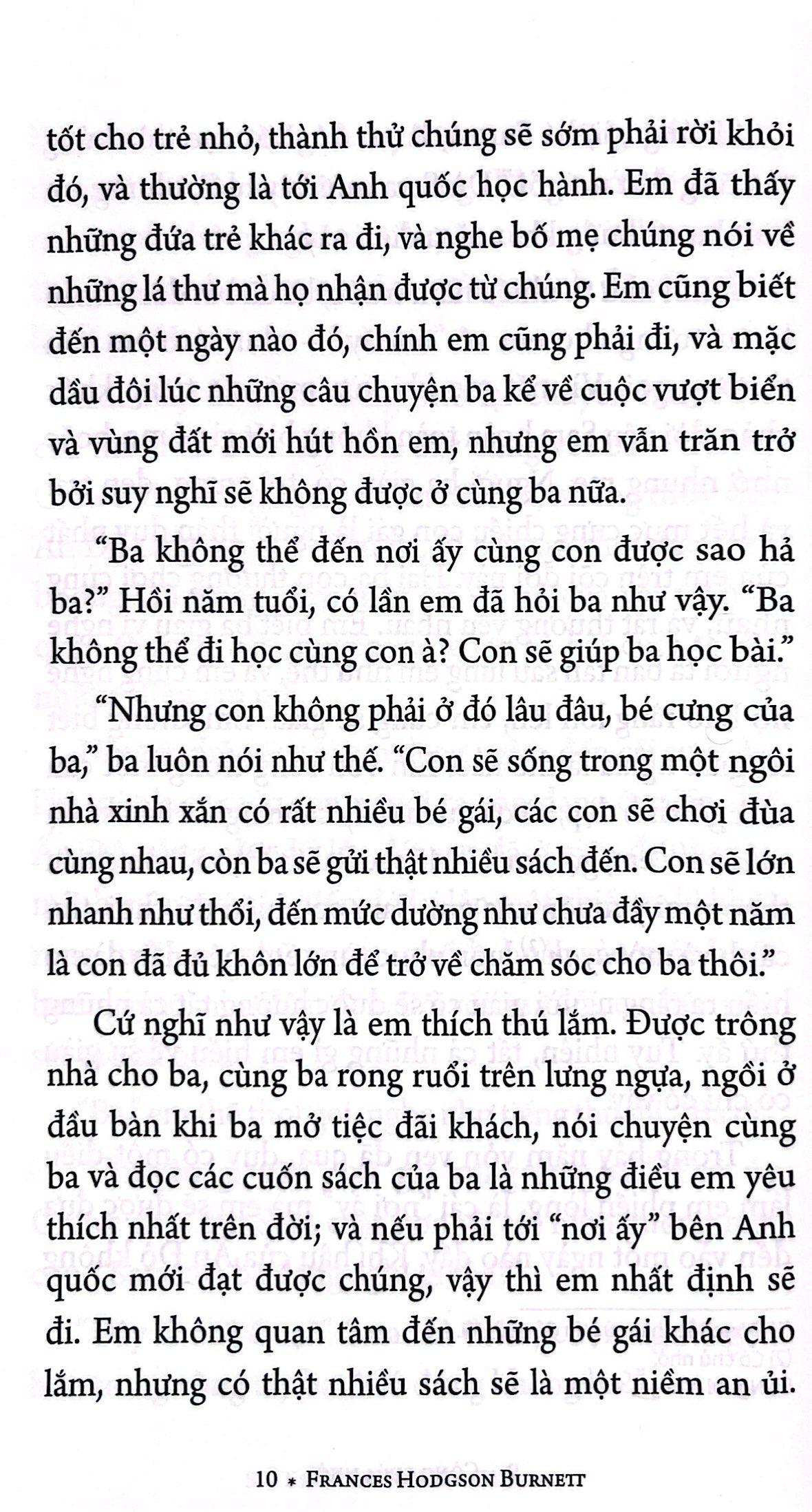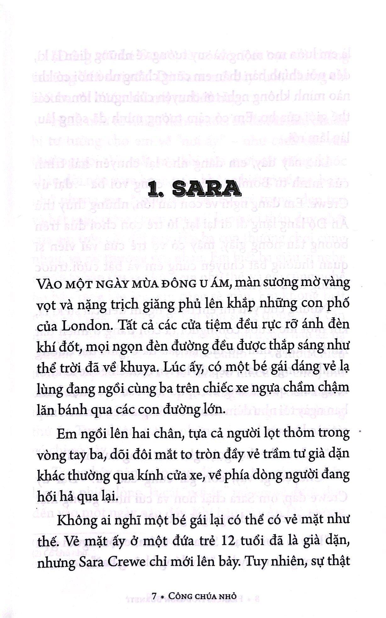 Sara Crewe mồ côi mẹ từ thuở mới lọt lòng và phải xa người cha ở Ấn Độ để đến Anh học một trường tư thục khi mới bảy tuổi. Cha em là một đại úy rất giàu có, nên em được chiều chuộng và sống trong nhung lụa từ nhỏ.