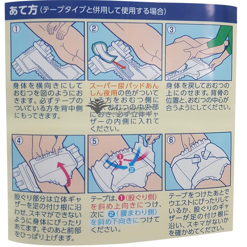 - Dùng cho ban đêm, phù hợp cho cả tã dán và tã quần Thành phần: Polyethylene, Poly-urethane spandex, Hook and loop, Nonwoven fabrics, Tissue, Pulp, Sap, Hot melt glue. Thông số kỹ thuật