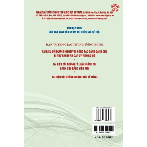 Thực hiện Nghị quyết số 37-NQ/TW ngày 09/10/2014 của Bộ Chính trị khóa XI về công tác lý luận và định hướng nghiên cứu đến năm 2030 và Hướng dẫn số 64-HD/BTGTW ngày 10/5/2018 của Ban Tuyên giáo Trung ương về thực hiện Chỉ thị số 23-CT/TW của Ban Bí thư khóa XII về tiếp tục đổi mới, nâng cao chất lượng, hiệu quả học tập, nghiên cứu, vận dụng và phát triển chủ nghĩa Mác - Lênin, tư tưởng Hồ Chí Minh trong tình hình mới; nhằm giúp các cấp ủy đảng, các địa phương triển khai chương trình bồi dưỡng, cập nhật kiến thức cho cán bộ, đảng viên ở cơ sở, Nhà xuất bản Chính trị quốc gia Sự thật phối hợp với Ban Tuyên giáo Trung ương Đảng tái bản cuốn sách "Tài liệu tham khảo bồi dưỡng, cập nhật kiến thức cho cán bộ, đảng viên ở cơ sở". Cuốn sách gồm 6 bài: Bài 1: Chủ nghĩa Mác - Lênin, tư tưởng Hồ Chí Minh, sự vận dụng sáng tạo và phát triển chủ nghĩa Mác - Lênin, tư tưởng Hồ Chí Minh trong sự nghiệp đổi mới ở nước ta hiện nay. Bài 2: Đẩy mạnh công nghiệp hóa, hiện đại hóa ở Việt Nam. Bài 3: Về xây dựng nền kinh tế thị trường định hướng xã hội chủ nghĩa ở Việt Nam. Bài 4: Về đảng cầm quyền và xây dựng Đảng trong sạch, vững mạnh trong điều kiện mới. Bài 5: Về xây dựng Nhà nước pháp quyền xã hội chủ nghĩa ở Việt Nam. Bài 6: Toàn cầu hóa và hội nhập quốc tế của Việt Nam.