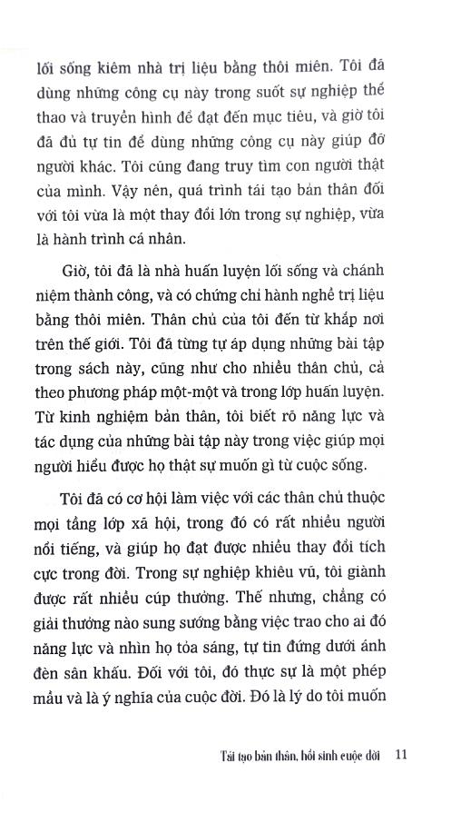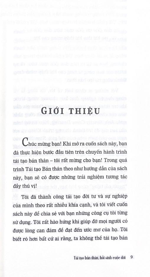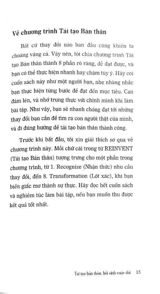 Cuốn sách sẽ giới thiệu phương pháp tái tạo bản thân gồm 8 bước cùng rất nhiều bài tập nhỏ, kết hợp cùng trải nghiệm của chính tác giả và những người đã áp dụng thành công phương pháp này, giúp bạn nhận diện và hiểu được những gì mình cần, hướng dẫn bạn cách vượt qua trở ngại và kiên định hướng đến mục tiêu. Với lối viết gần gũi, dễ hiểu, không giáo điều áp đặt, cuốn sách sẽ nhẹ nhàng nhắc nhở bạn kiên trì thực hiện từng bước để đạt đến điều bạn hằng mong mỏi.